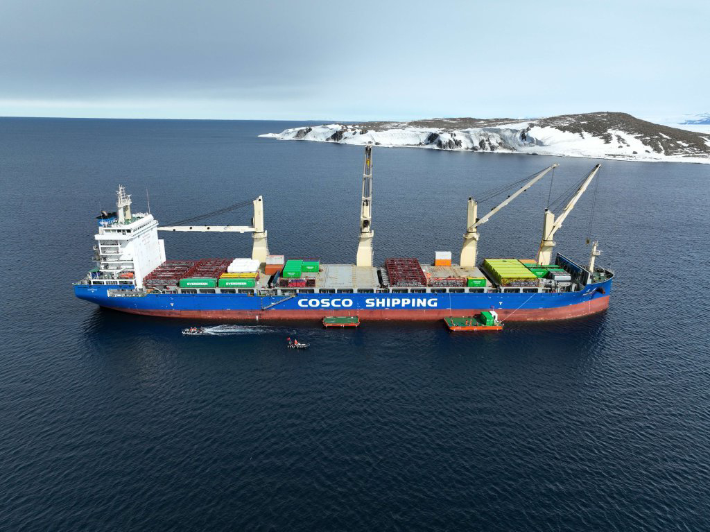 12月7日,执行中国第40次南极考察任务的“天惠”轮开展卸货作业(无人机照片)。