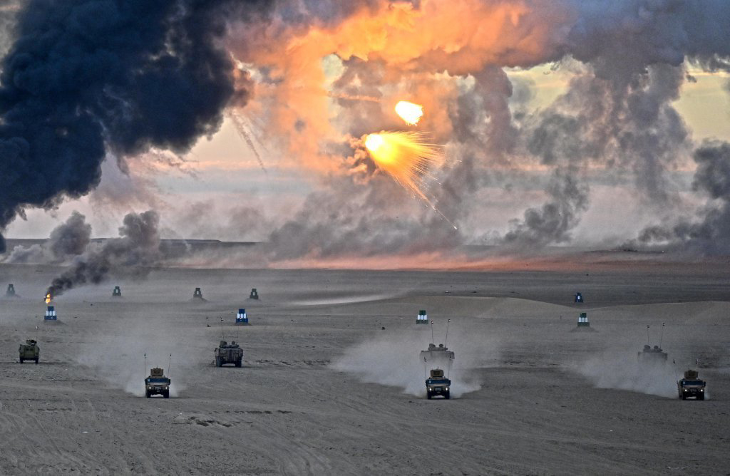 12月6日,在科威特杰赫拉省,军事车辆参加科威特与海湾合作委员会军事机构的联合军演。