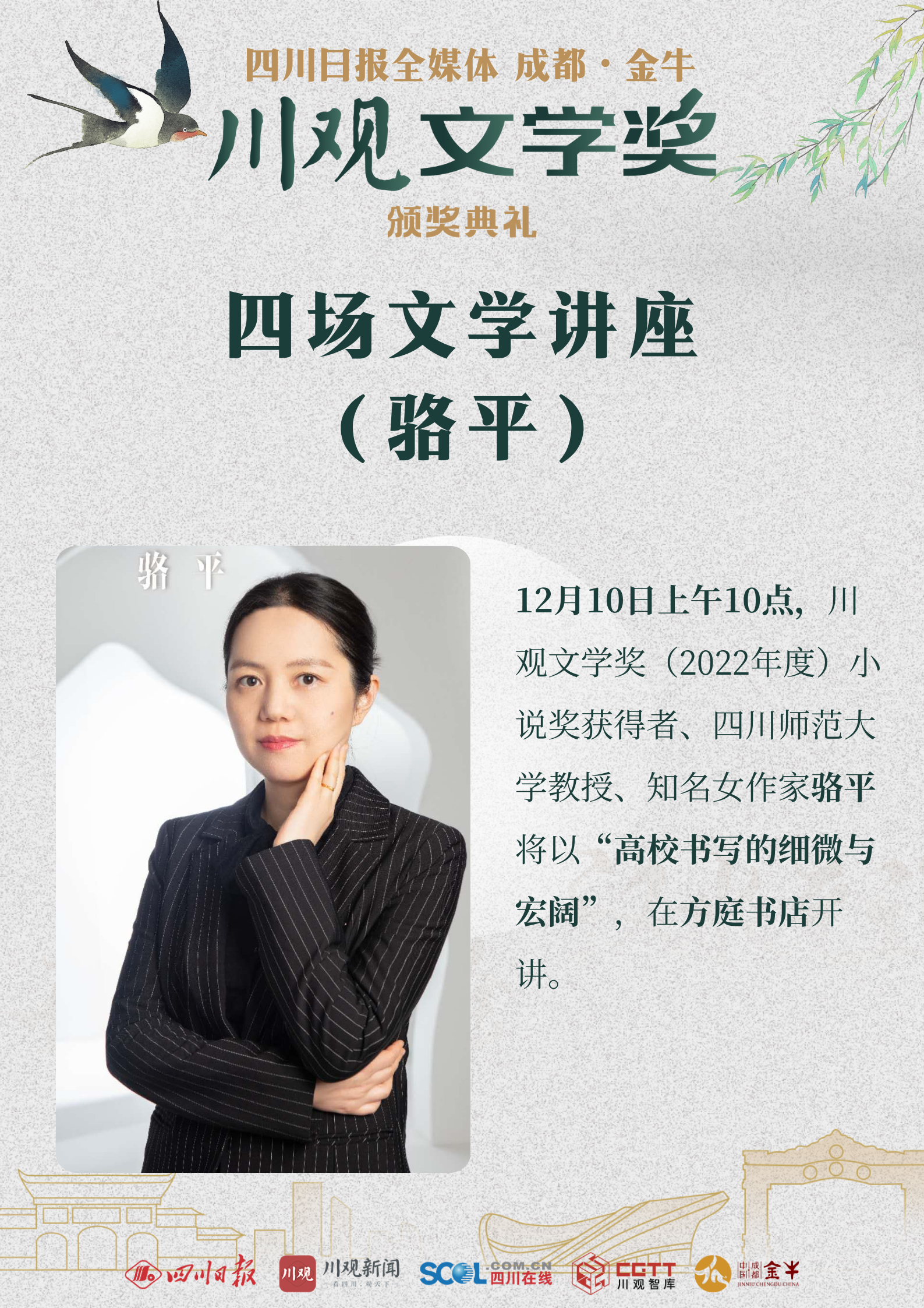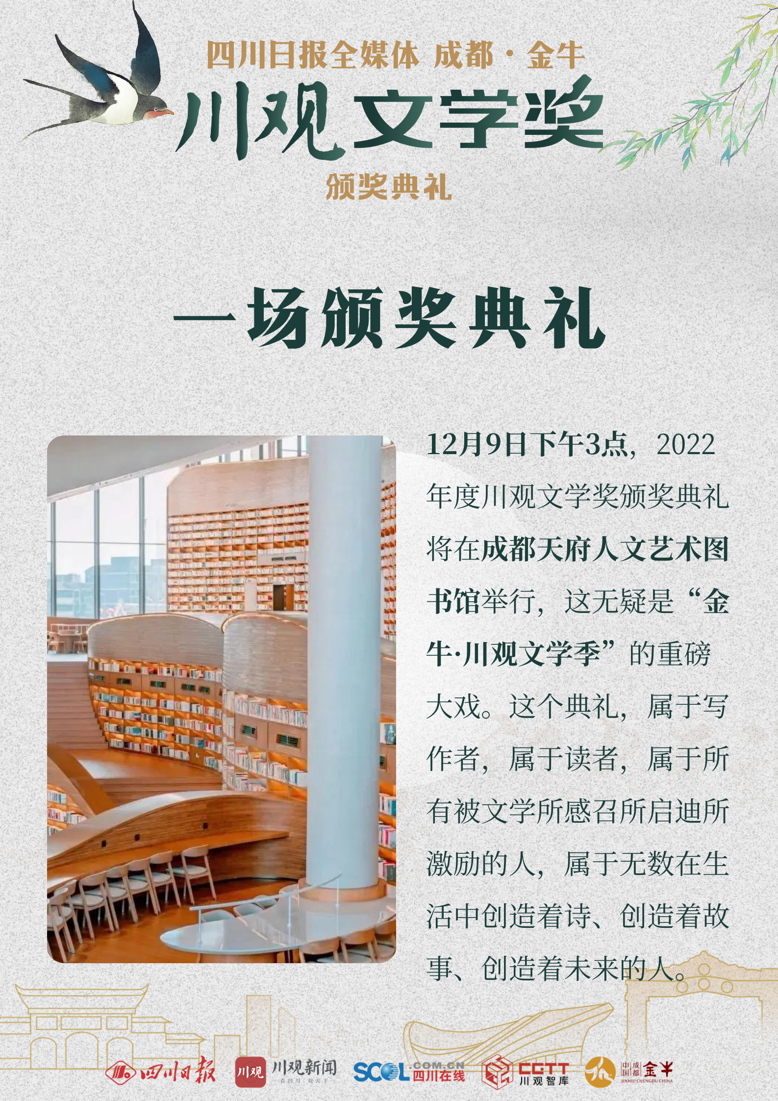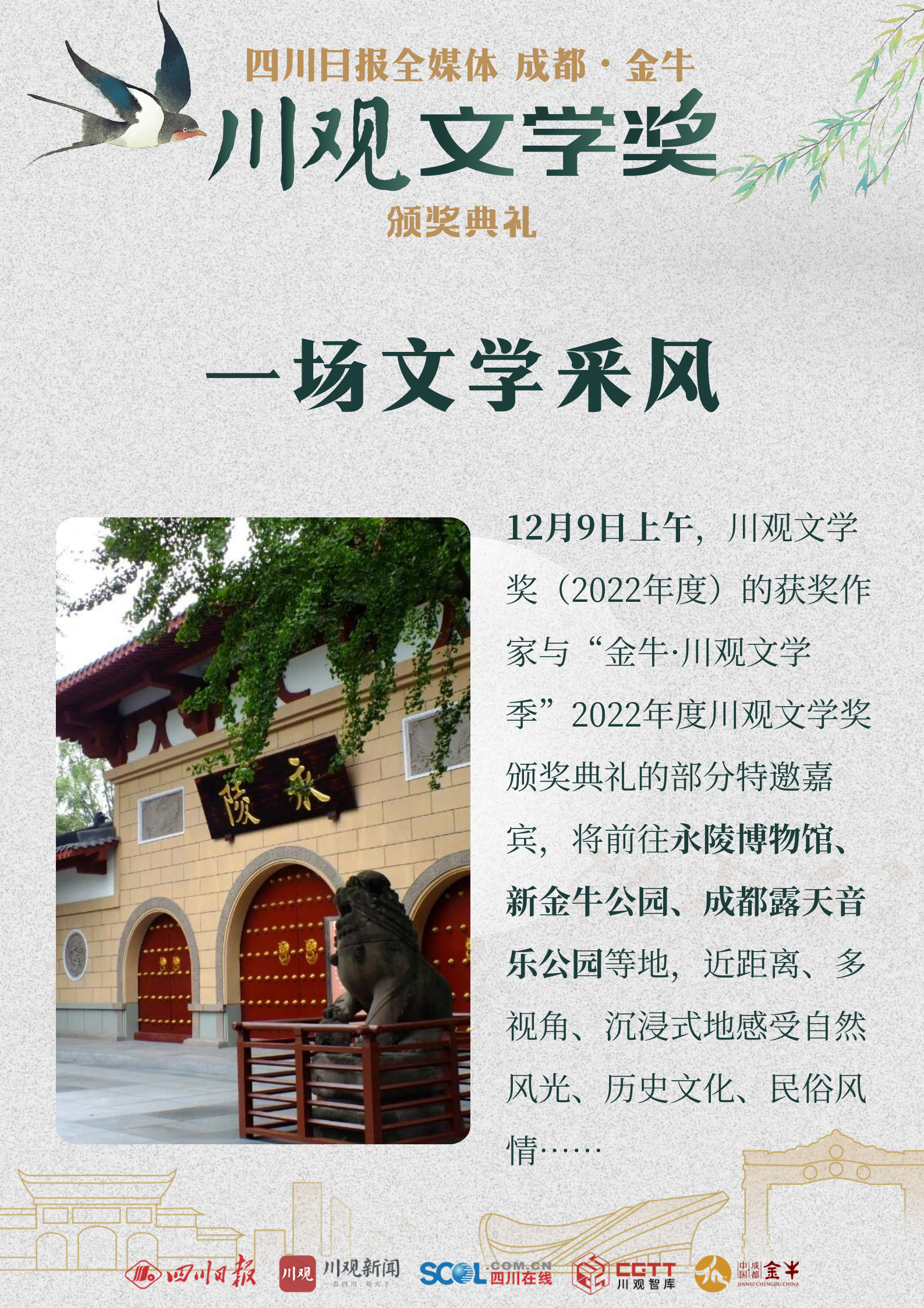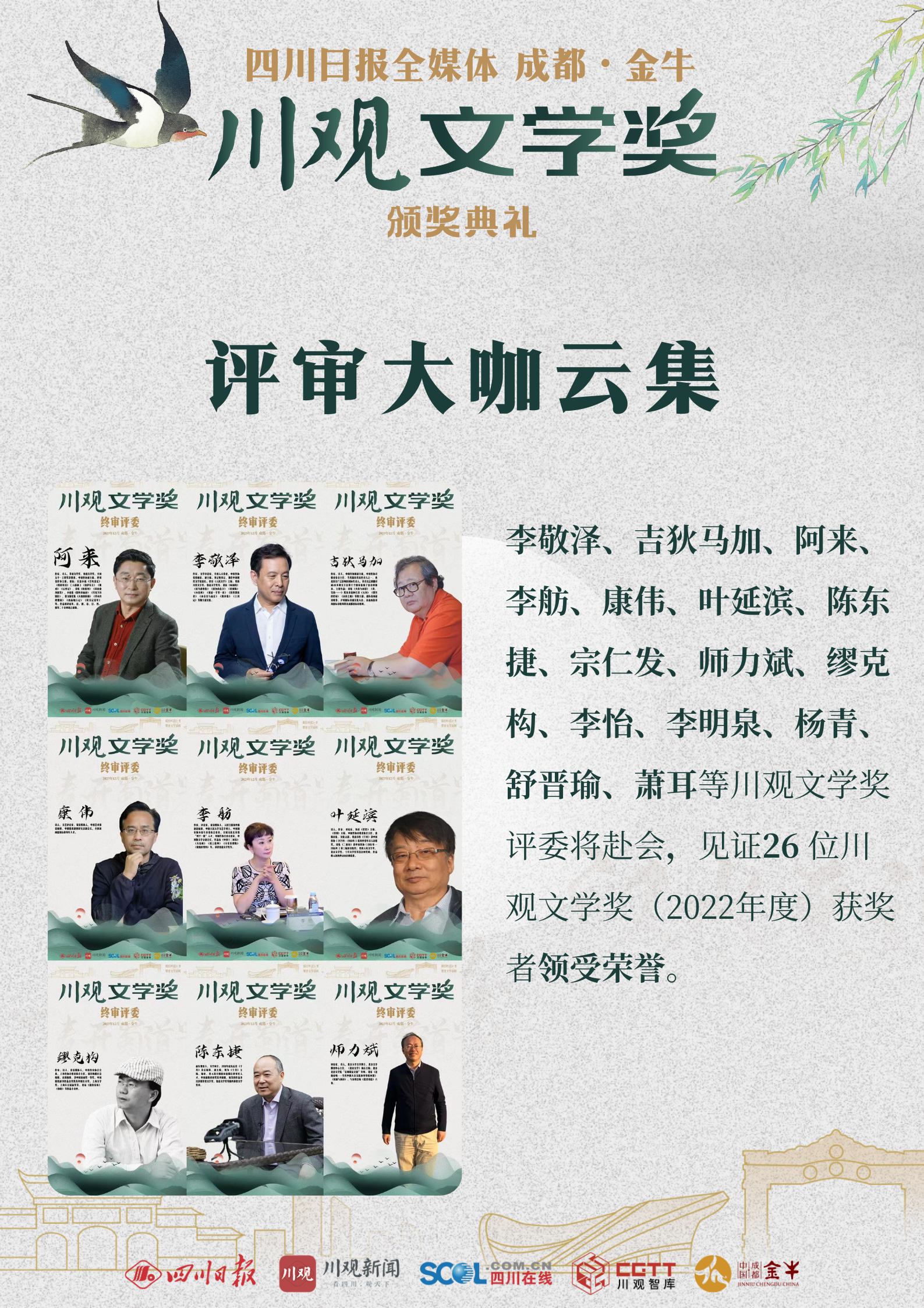 12月8日,“金牛·川观文学季”2022年度川观文学奖颁奖活动将在成都市金牛区正式启幕。来自全国各地的文学名家、评论家、编辑家与川观文学奖(2022年度)获奖作家、评委代表、出版社代表、媒体代表以及省市区各单位相关负责人等,将齐聚人文金牛。