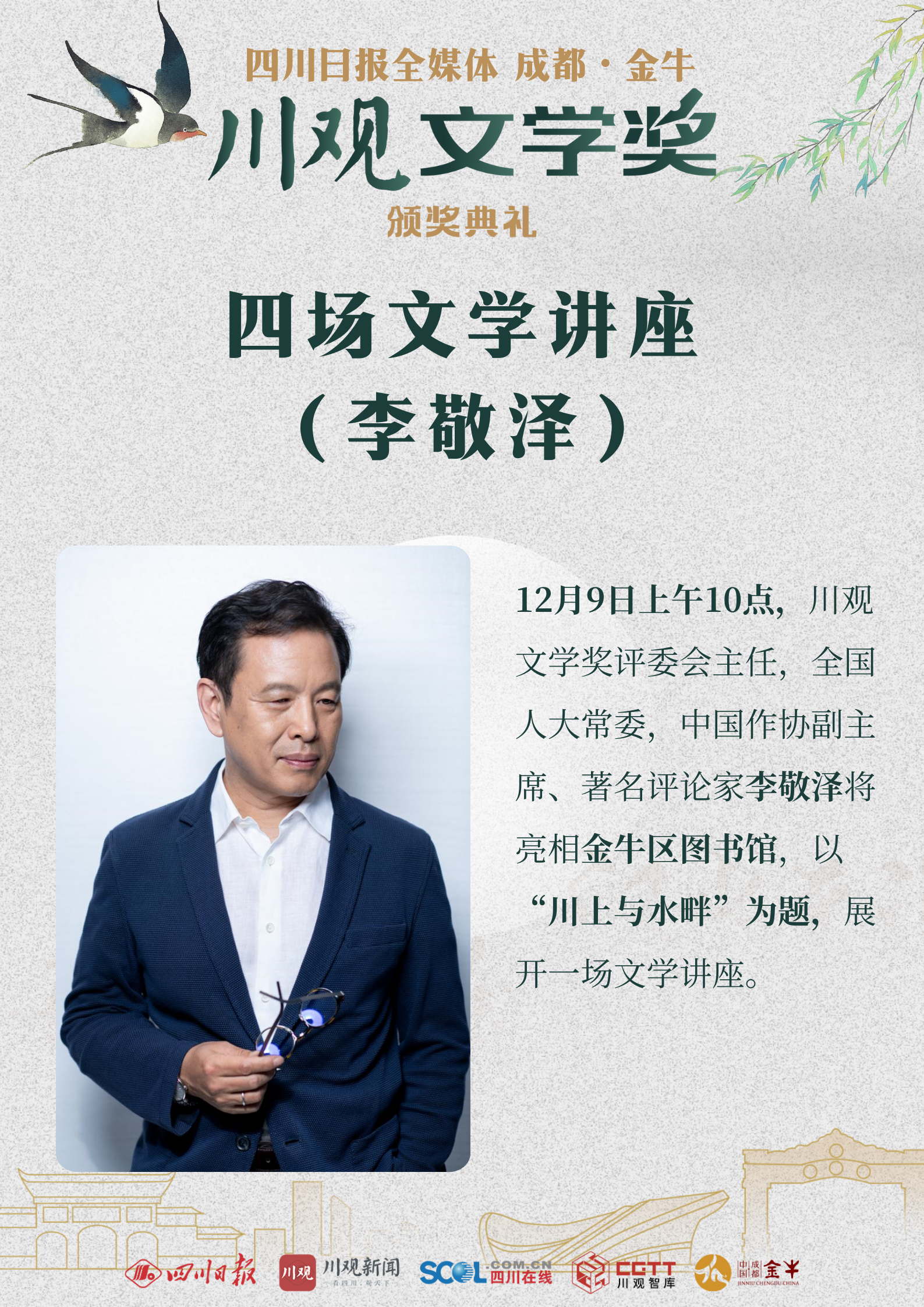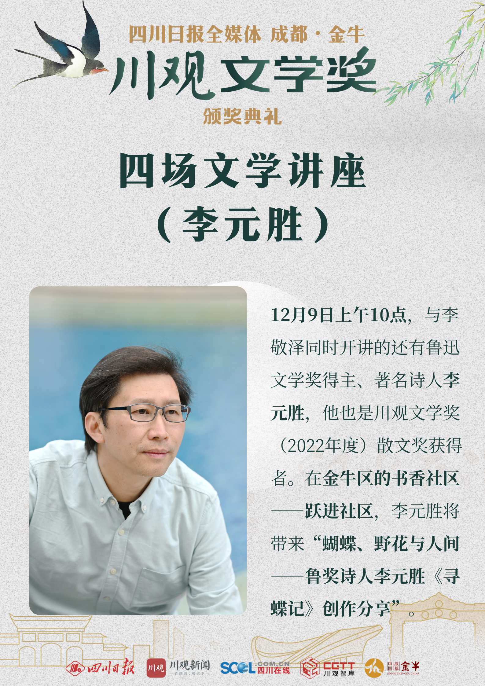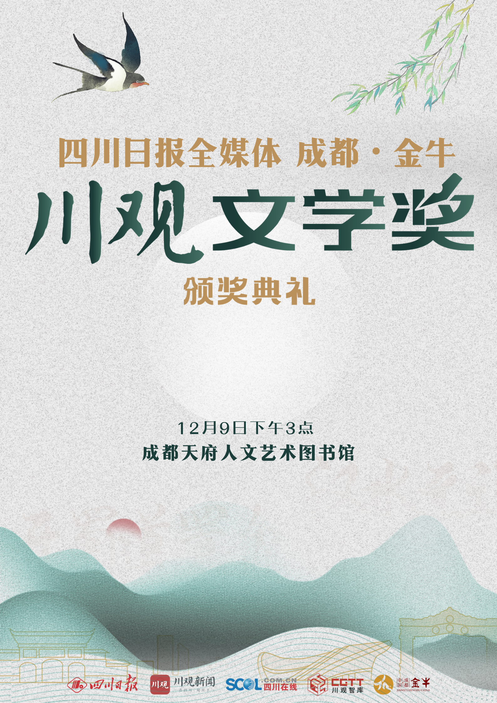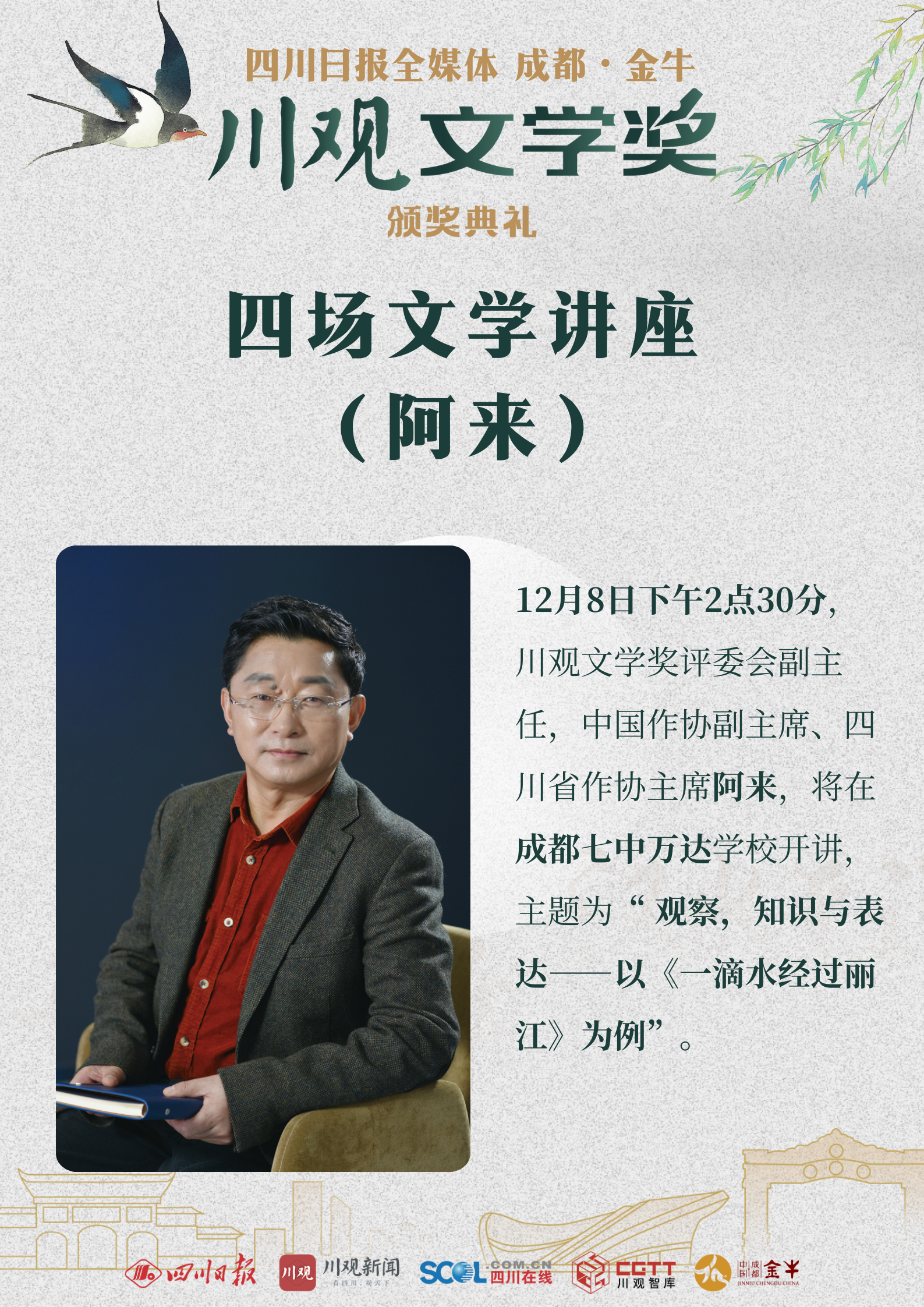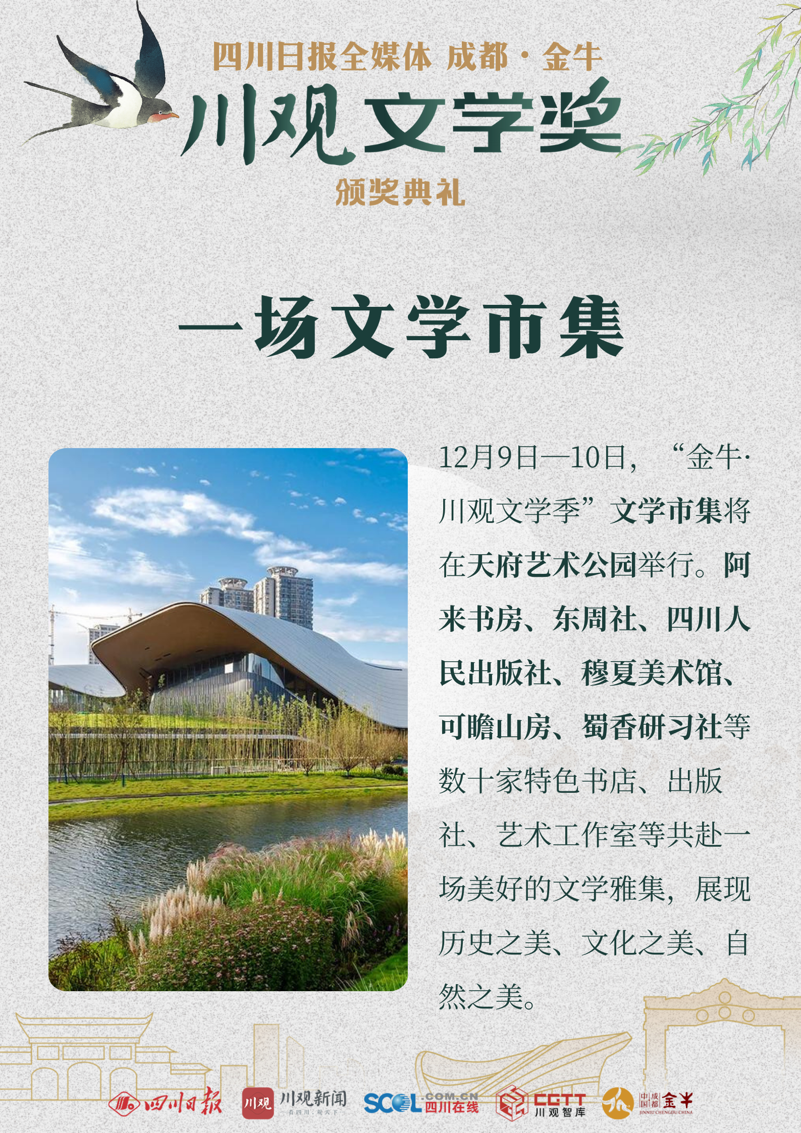 12月8日,“金牛·川观文学季”2022年度川观文学奖颁奖活动将在成都市金牛区正式启幕。来自全国各地的文学名家、评论家、编辑家与川观文学奖(2022年度)获奖作家、评委代表、出版社代表、媒体代表以及省市区各单位相关负责人等,将齐聚人文金牛。