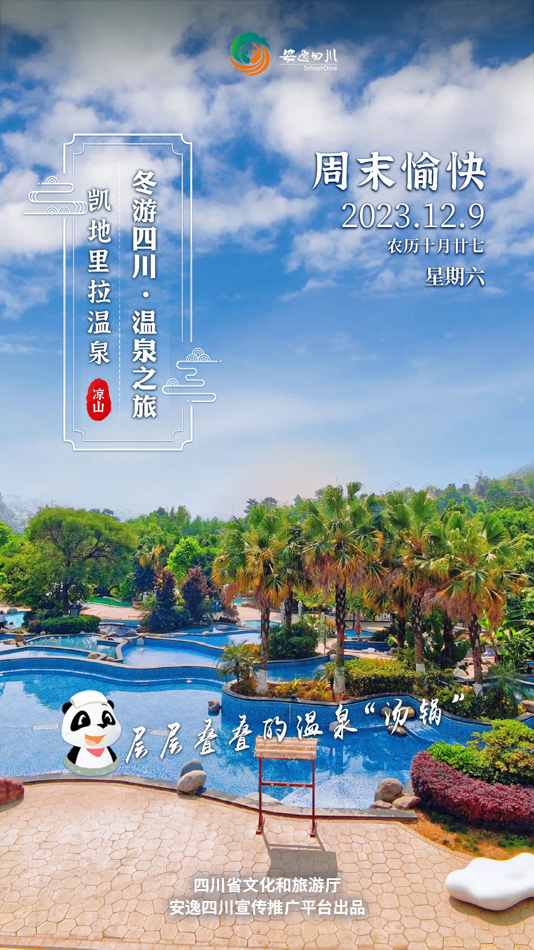 12月9日,星期六,周末愉快。今日安逸四川日历海报“冬游四川”之旅走进凉山州凯地里拉景区,沐浴温泉享暖阳。
