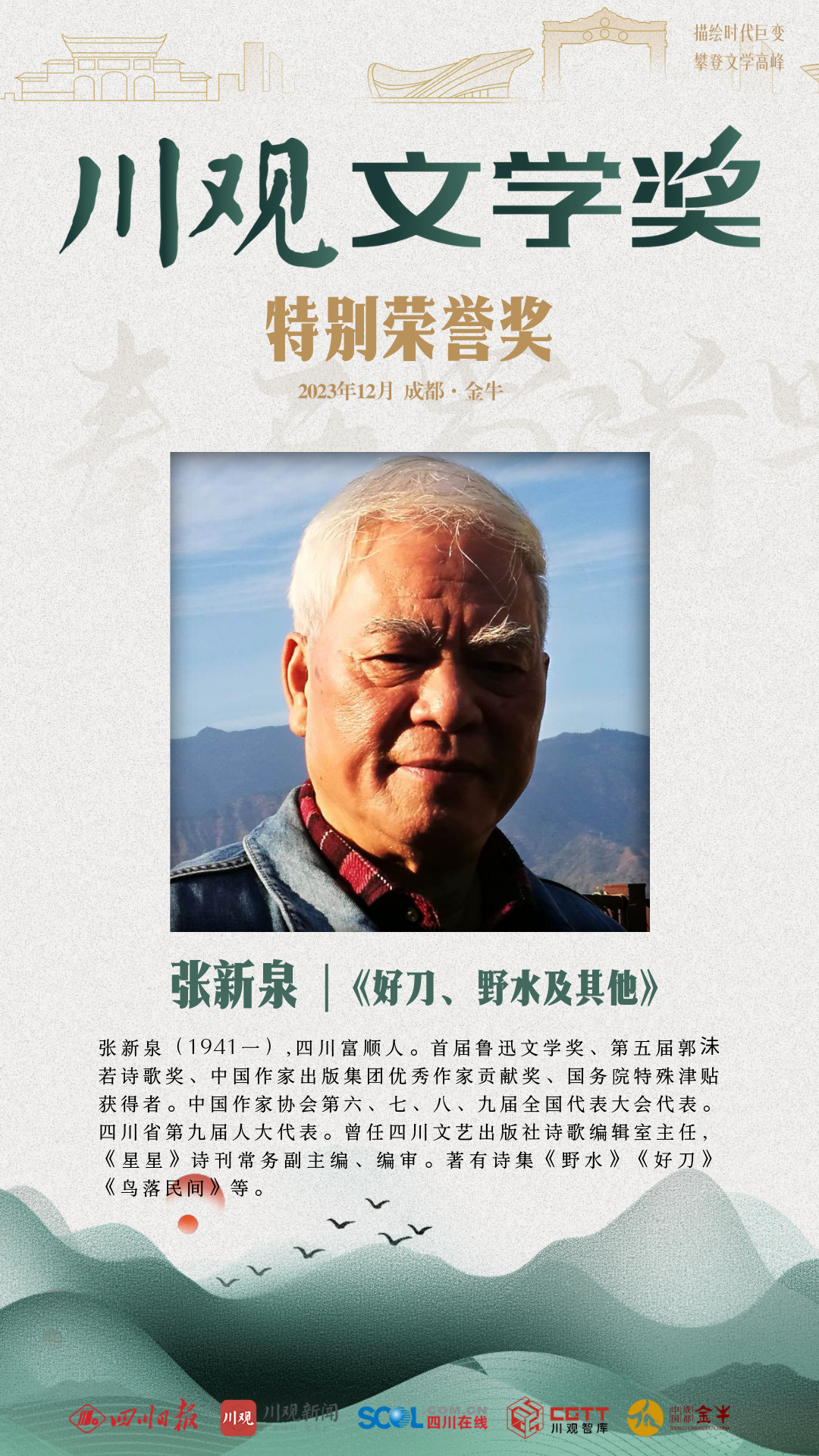 12月9日下午,在由四川日报社主办,成都市文学艺术界联合会协办,成都市金牛区文学艺术界联合会、成都市金牛区融媒体中心承办的“金牛·川观文学季”2022年度川观文学奖颁奖典礼上,张新泉获得川观文学奖(2022年度)特别荣誉奖。