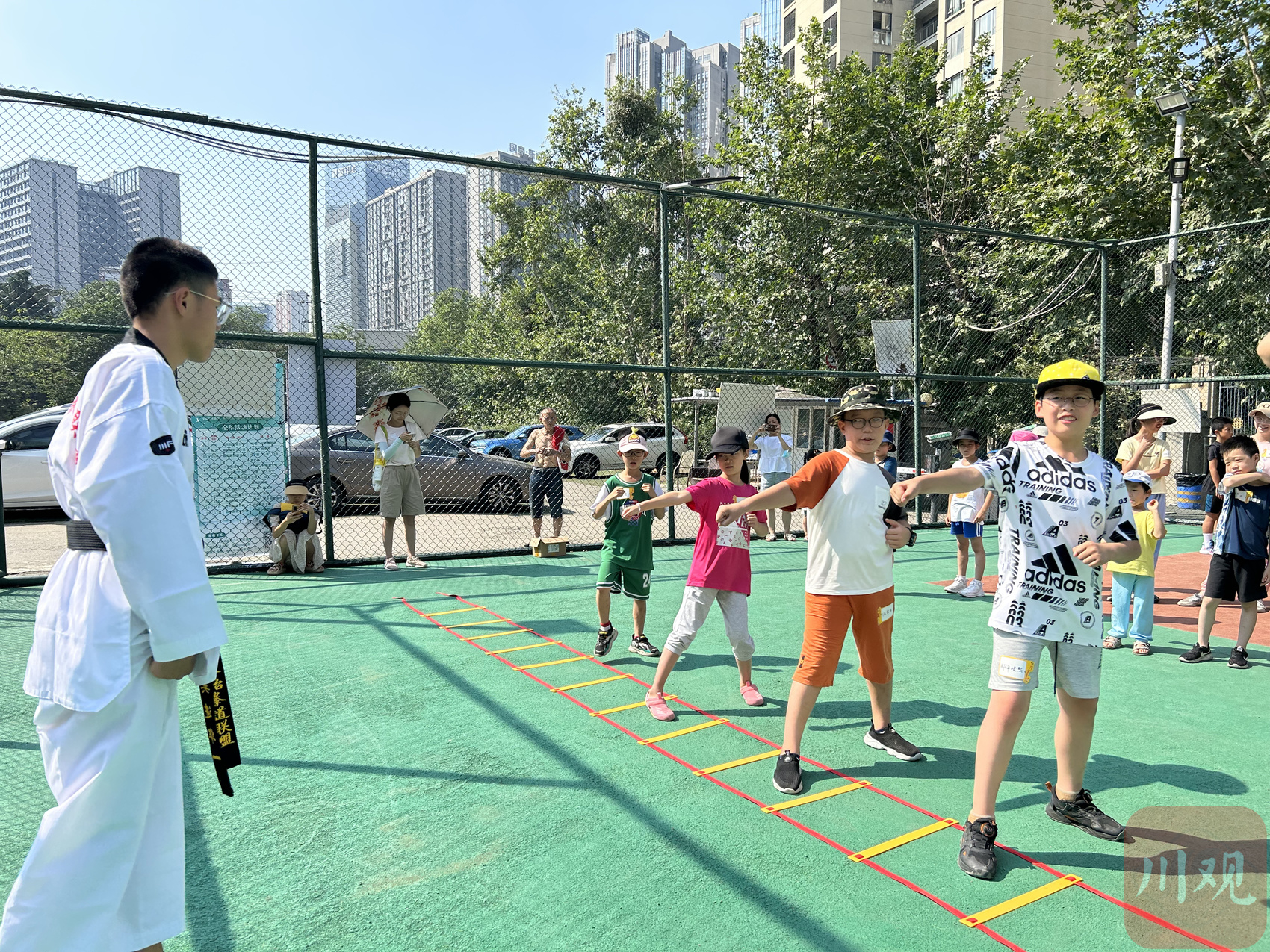 “小暑”节气,孩子们在社区运动场学习大运会比赛项目跆拳道。