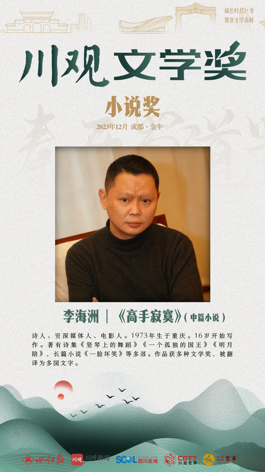 诗意的语言、跌宕的故事、精巧的构思、电影细节的手法,是这部作品的重要特点。诗人小说家,最擅长将诗意作为一种观察生活的方法,李海洲有自觉的结构意识,将哲学、禅意、人生、意外交织,揭示卑微却高贵、辽阔却温暖的人生。以诗意进入叙事文学,融入生命体验,李海洲在承载文学创作更为深厚的使命感同时,也以凌厉畅达的语言回馈这个他所热爱的世界。有鉴于此,授予李海洲《高手寂寞》川观文学奖(2022年度)小说奖。