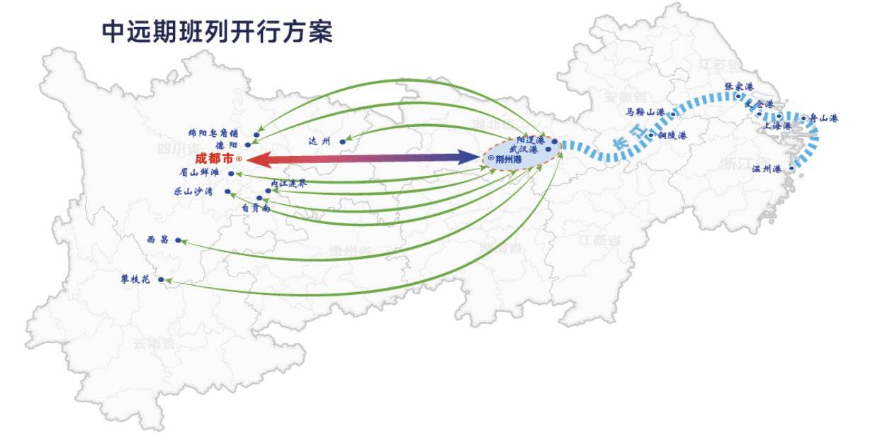 四川“长江班列”由蜀道集团作为省级运营主体和中国铁路成都局集团有限公司共同开行,分为北、中、南三条通道,直连四川各地和湖北荆州。初期计划每日双向开行各1列,货源以元明粉、玻璃纤维、铁精矿、化肥、叶蜡石粉、锂辉石等为主。远期实现全年2500—3000列常态化双向开行,逐步形成辐射整个西部地区的长江班列货运物流网络。