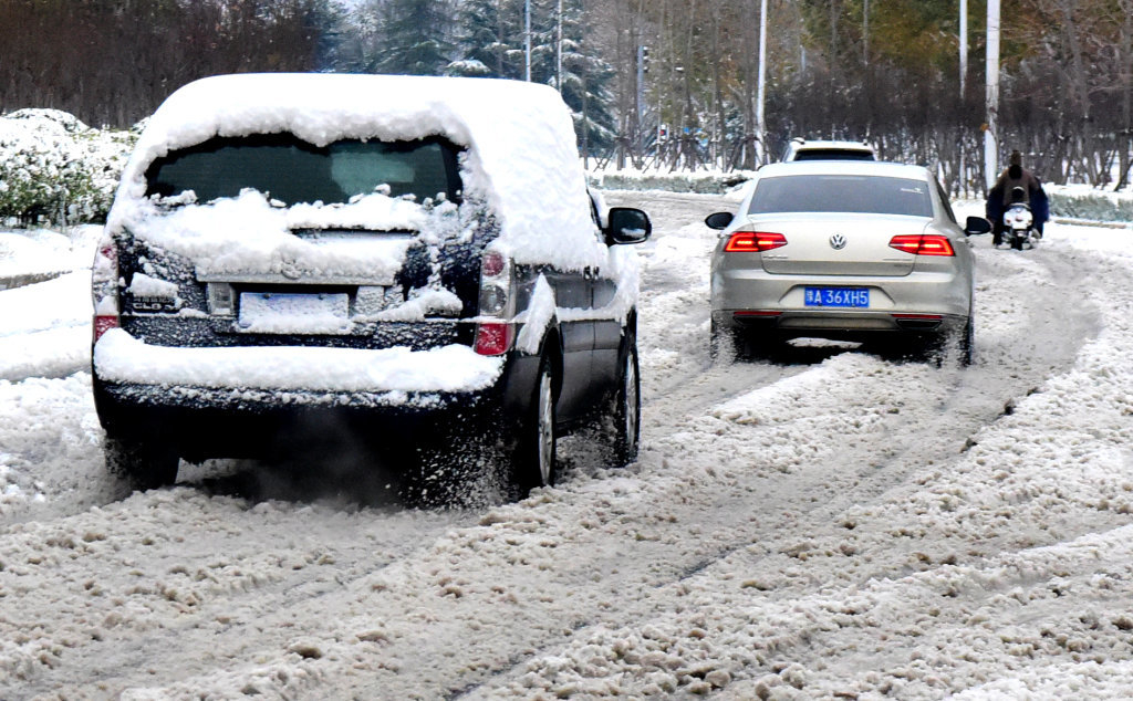 12月11日,车辆在雪中缓慢行进。