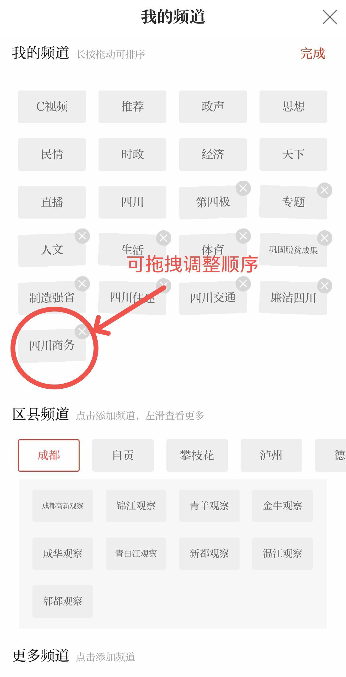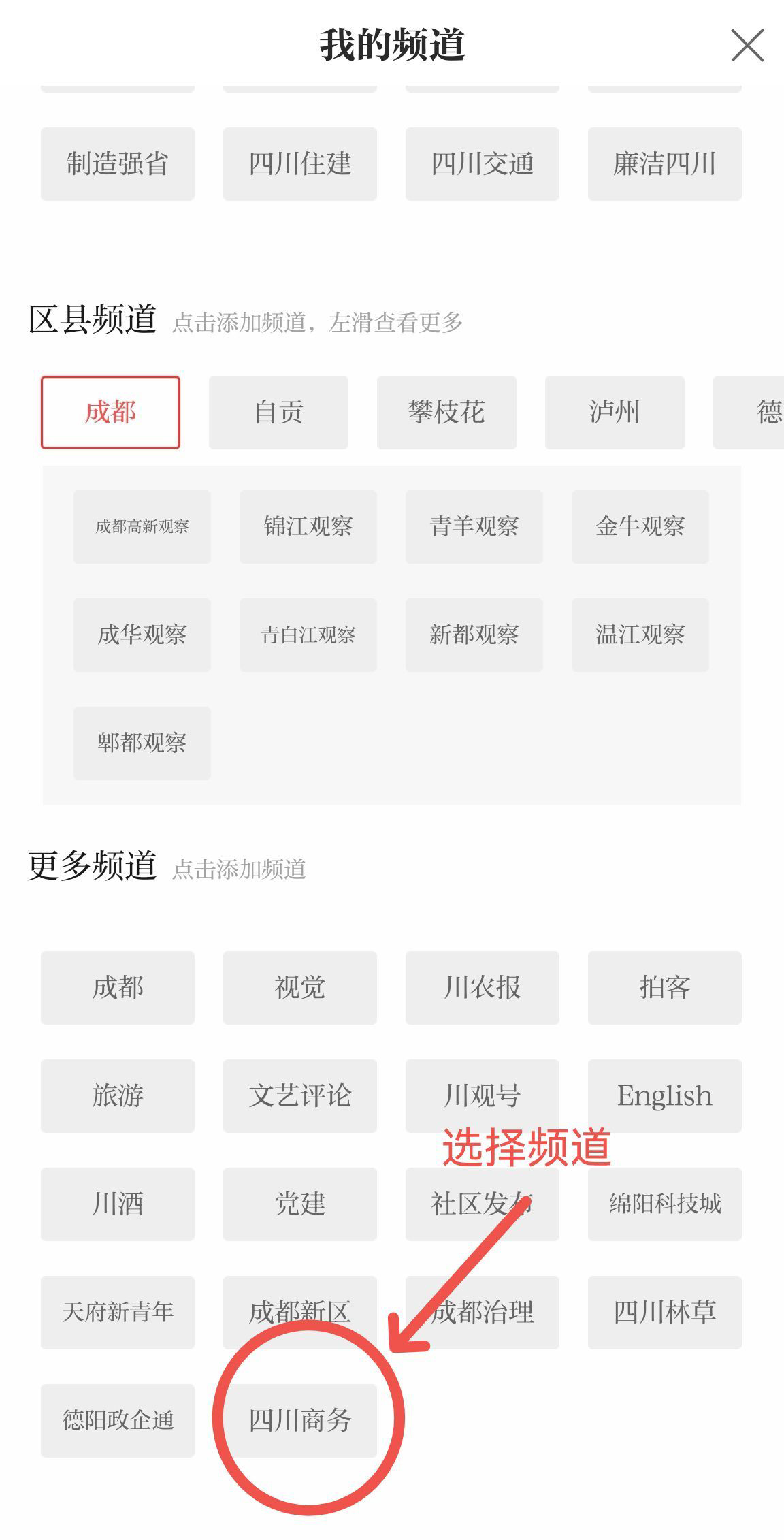 步骤二:频道订阅拉到最下端,点击“四川商务”模块,使其弹到“我的频道”处