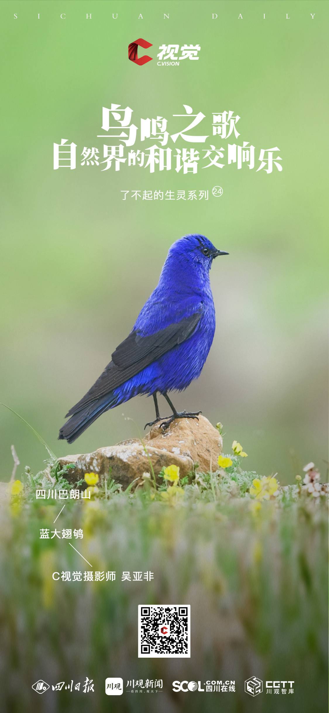 2018年6月,C视觉摄影师吴亚非在巴朗山上记录了蓝大翅鸲。这是一种高山鸟类,夏季主要栖息于海拔3500-5500米的高山森林灌丛和多岩石的高原草地。