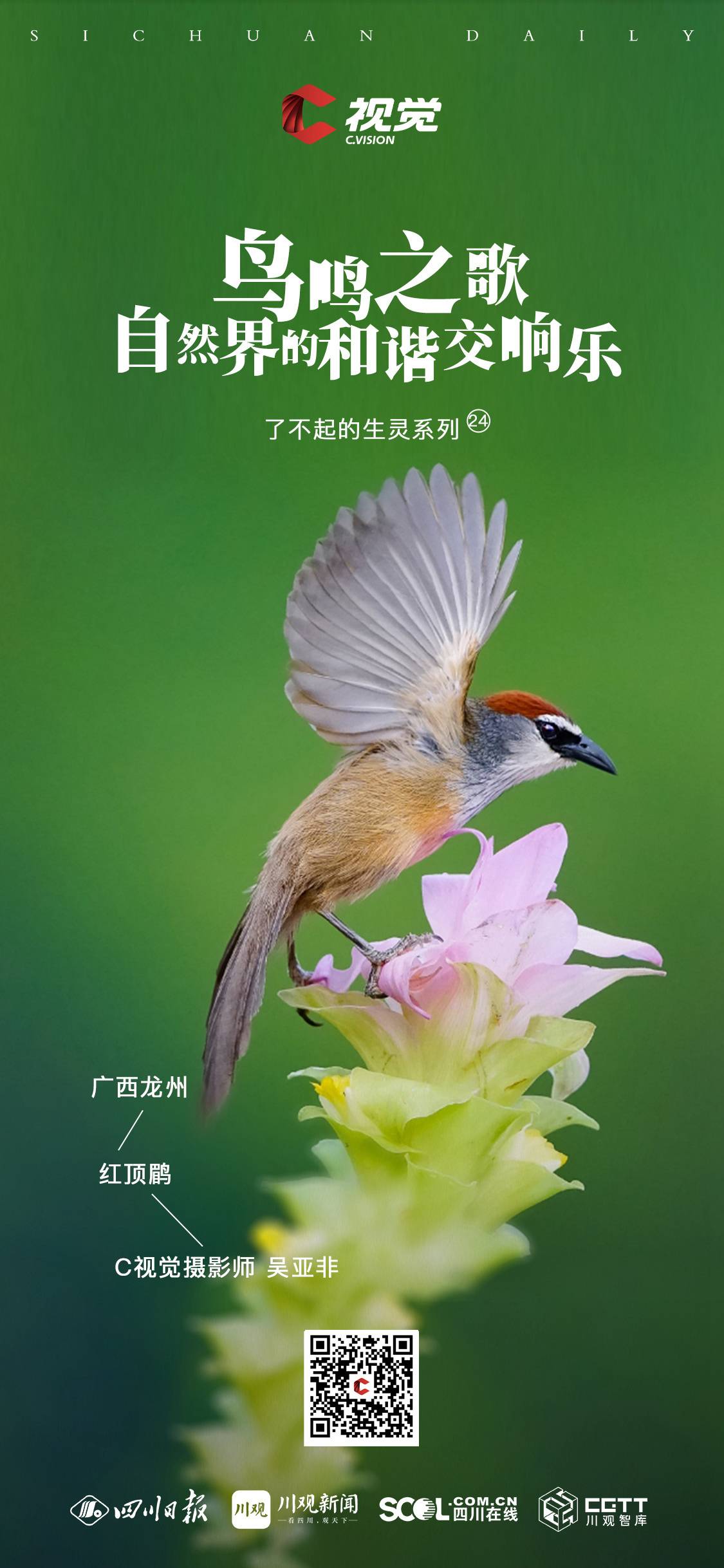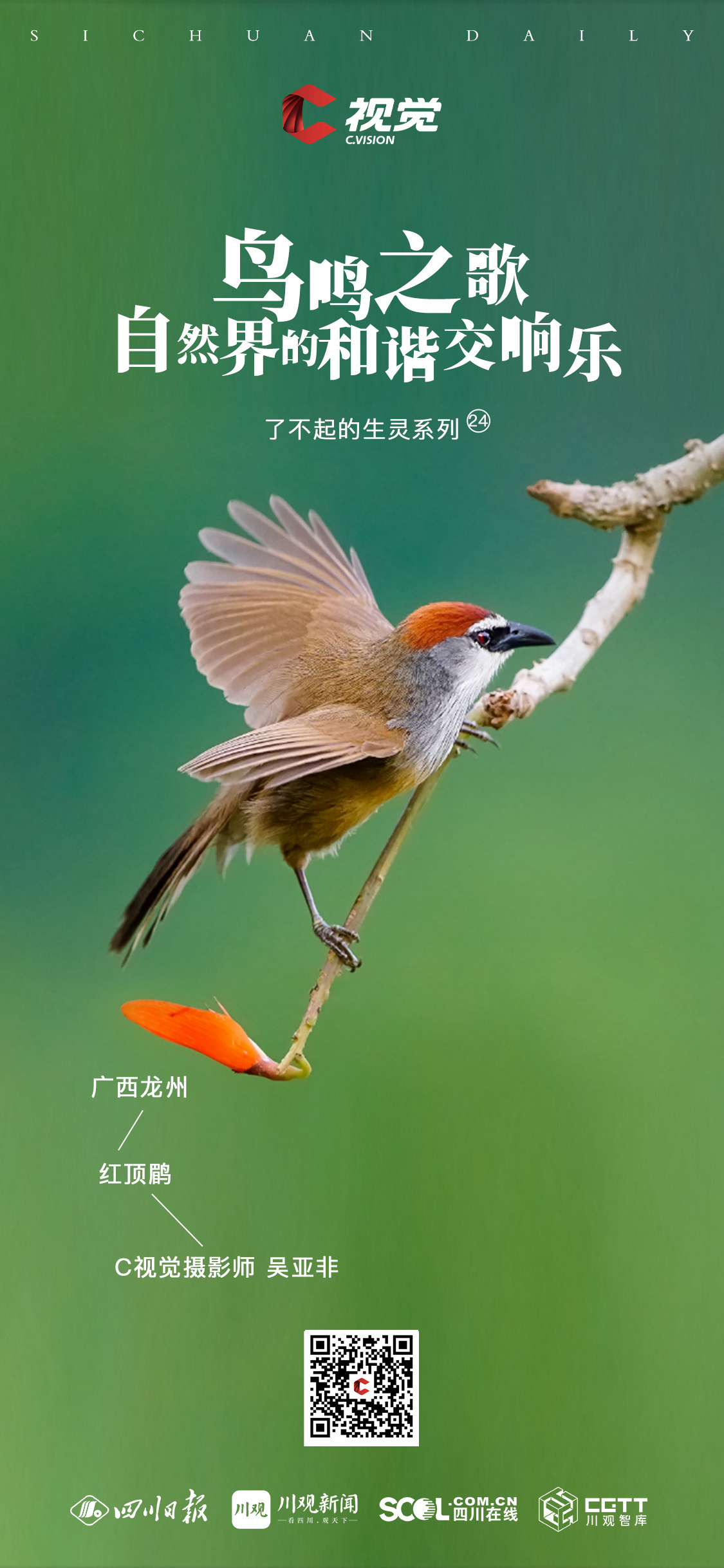 2018年4月,C视觉摄影师吴亚非在广西龙州记录了红顶鹛。这种鸟类主要栖息于海拔1000米以下的低山、丘陵和平原地带的竹丛、灌丛、高草丛以及农田地边、芦苇沼泽和林缘灌丛草地。