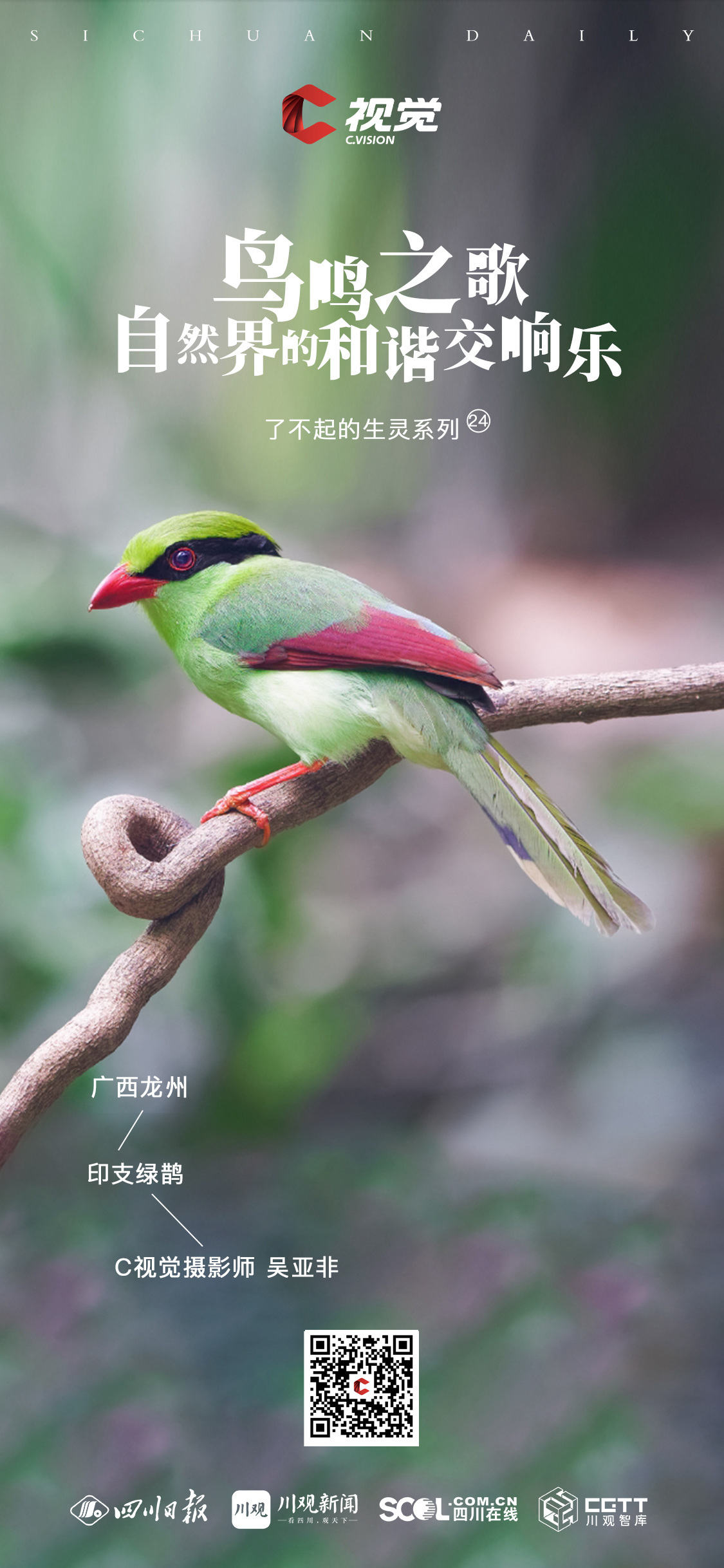 2018年4月,C视觉摄影师吴亚非在广西龙州记录了印支绿鹊。这种鸟类栖息地包括亚热带或热带的湿润低地林和亚热带或热带的湿润山地林,主要栖息于山地的原始和次生林中。