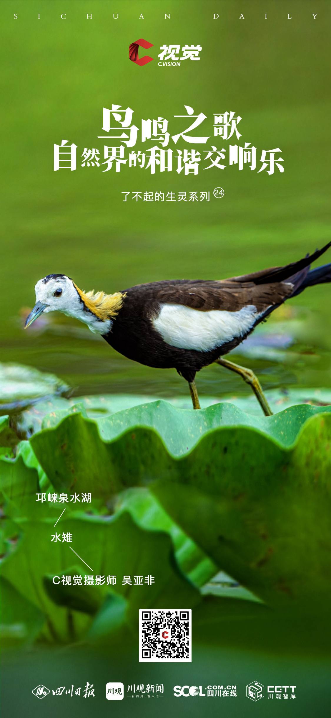2023年8月,C视觉摄影师吴亚非在邛崃泉水湖记录了水雉。这种鸟类喜欢栖息于富有挺水植物和漂浮植物的淡水湖泊、池塘和沼泽地带,常在浮游植物的叶片上行走找食。