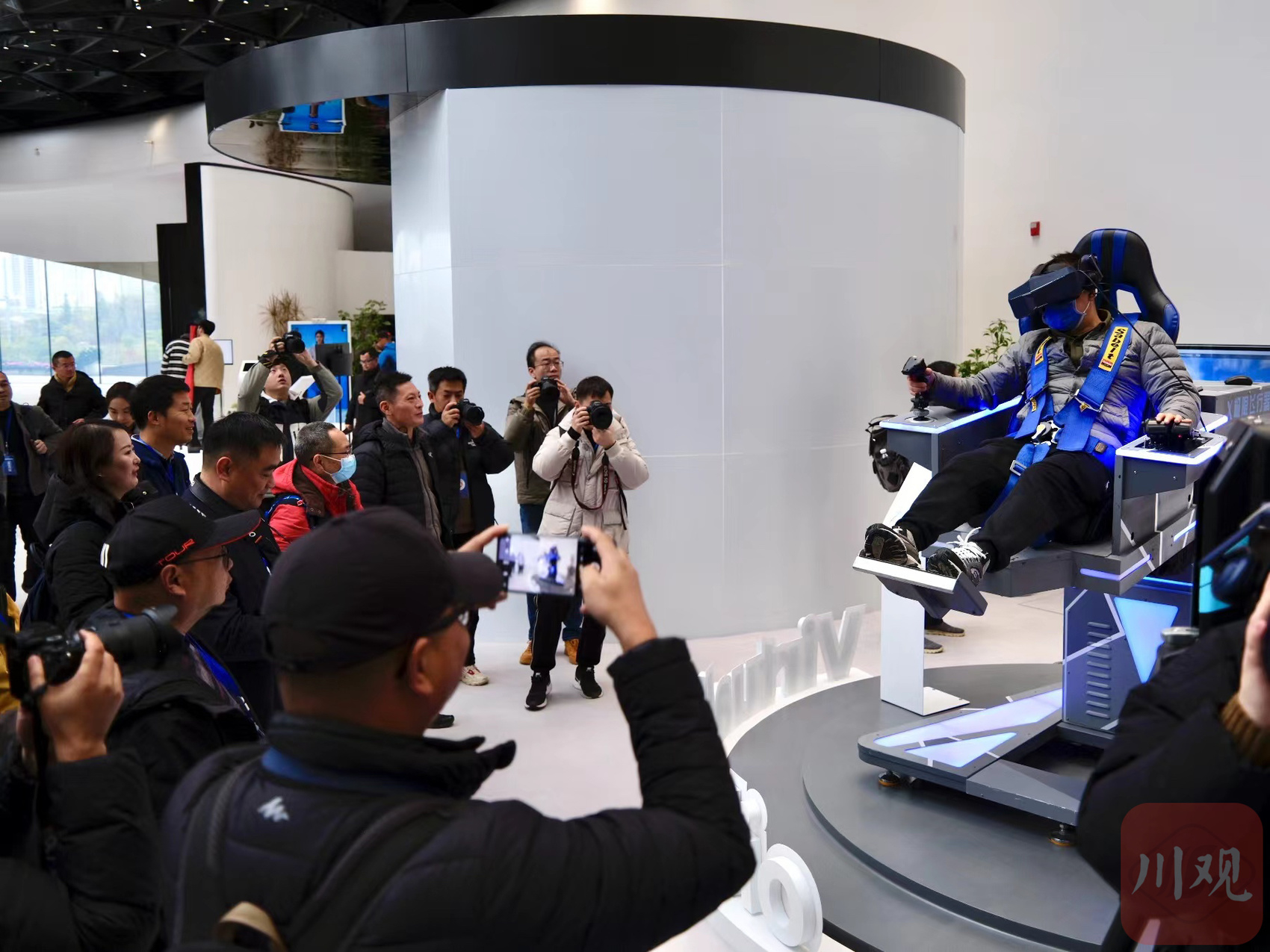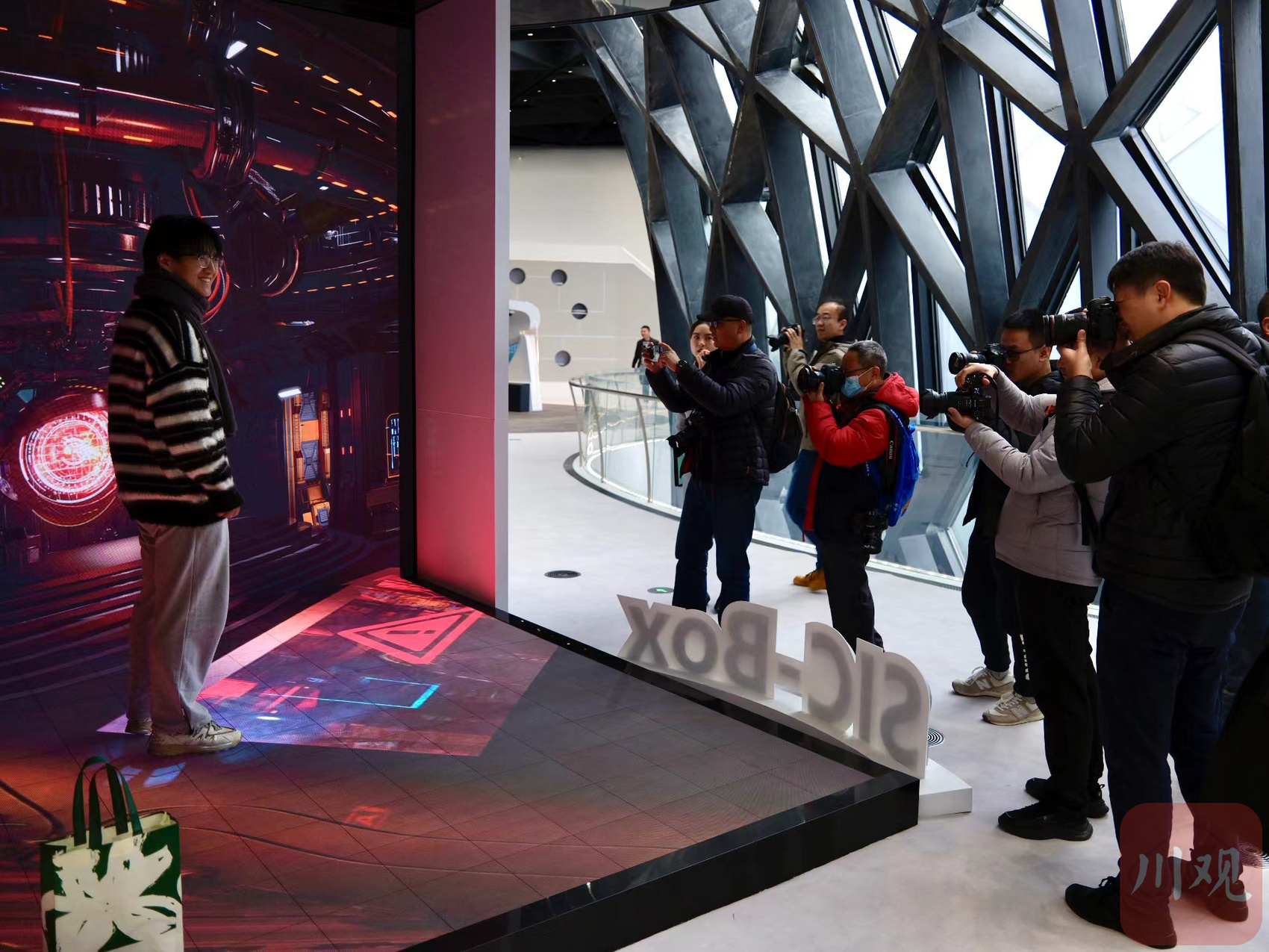 在二楼、三楼的科技创新成果展示区,目前展出的都是成都科技创新的硬核成果。在这里,可以近距离了解一个个“成都造”硬核科技,感受城市澎湃的创新动能。在科学家会客厅,团员们不仅可以“沉浸式”体验多项“黑科技”,还能感受到智能服务机器人的现场服务,和它互动;在高速动车组模拟驾驶舱内,团员们能体验“高铁司机”的乐趣;骑上天府绿道VR自行车,团员们能感受天府绿道的勃勃生机;在刑侦系统体验区,团员们可以透过VR视角亲临刑侦现场,感受和体验侦探的惊险和刺激。