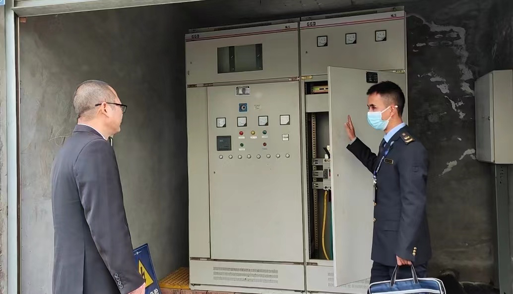 执法队员向企业负责人强调配电柜需上锁关闭,并张贴“有电危险”警示标志