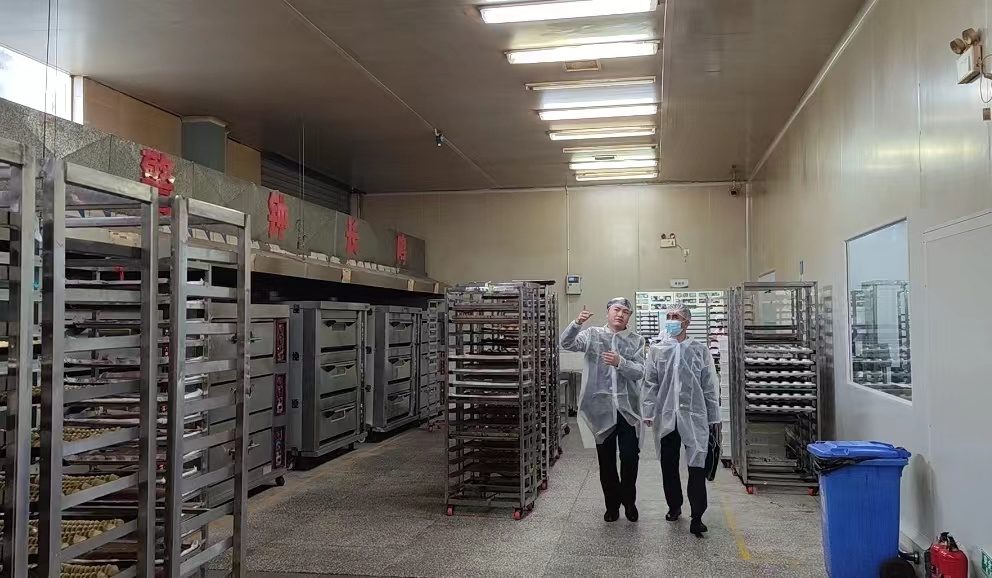 生产车间内,记者看到工人们将一盘盘码放整齐的面包放入烤炉,还不时打开炉门,翻面烘烤。“烤炉温度较高,最好张贴一些注意高温的警示标志。”彭少林告诉记者,面包烘烤涉及到天然气使用,车间内装有多个燃气探测和报警装置,也是检查的重点。彭少林仔细查看了烘烤车间顶部的几个燃气探测器,并检查了墙上的报警器,确认运行正常。