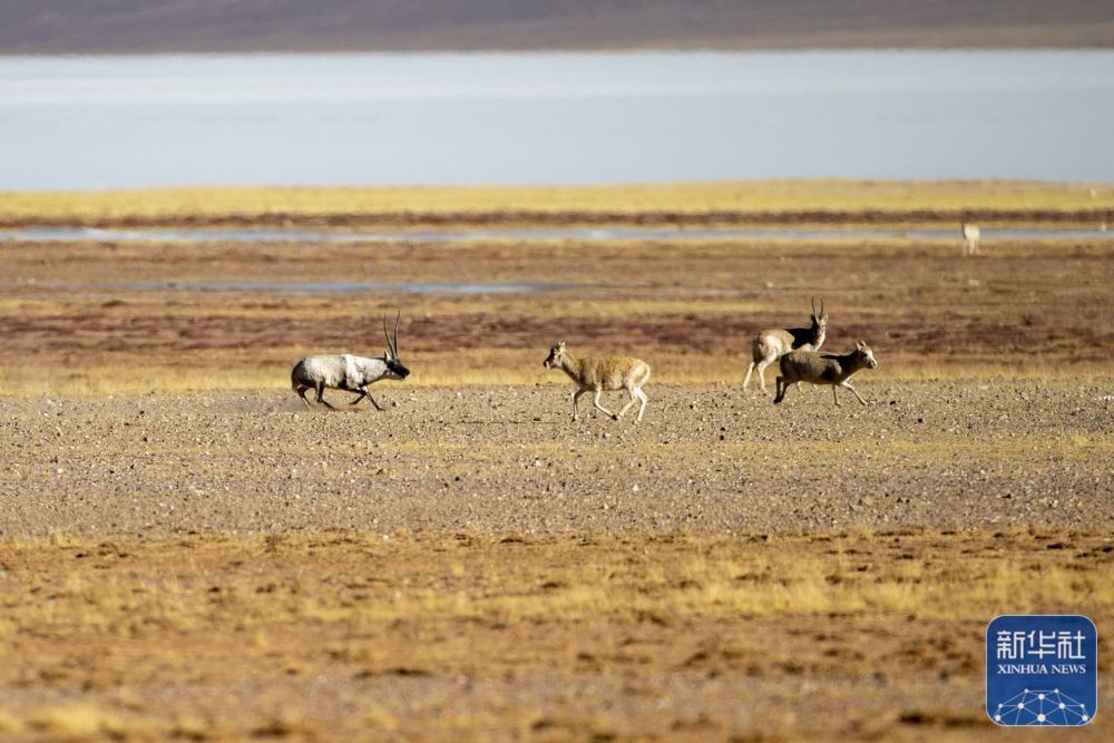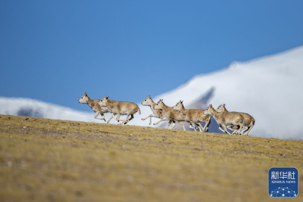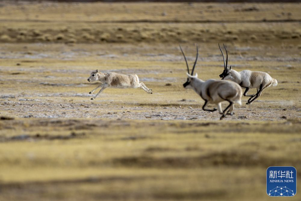 ↑ 在羌塘国家级自然保护区,一群雌性藏羚羊在奔跑(12月16日摄)。新华社记者 姜帆 摄