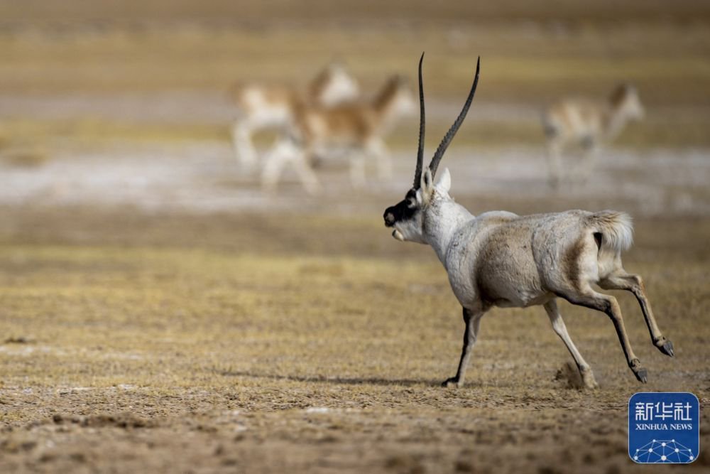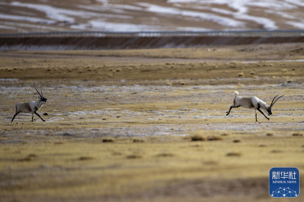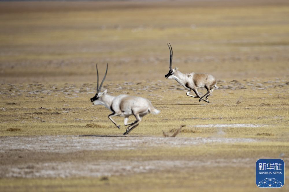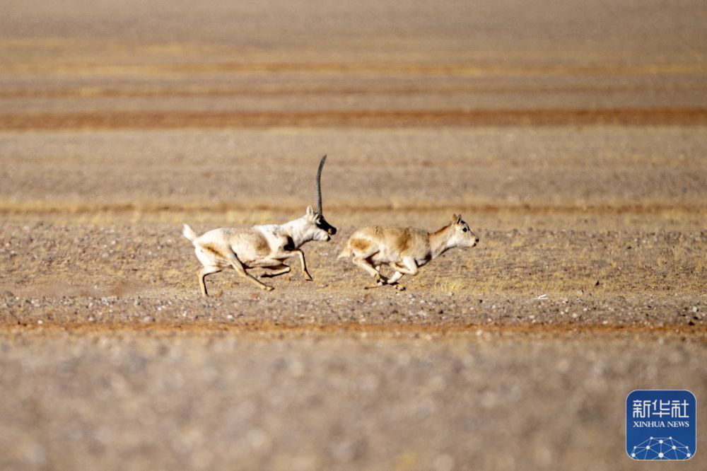 ↑ 在羌塘国家级自然保护区,一只雄性藏羚羊在奔向雌性(12月16日摄)。新华社记者 姜帆 摄