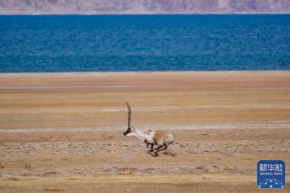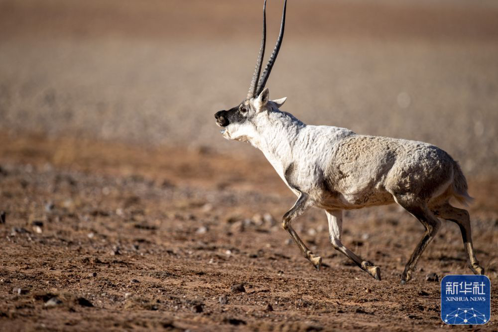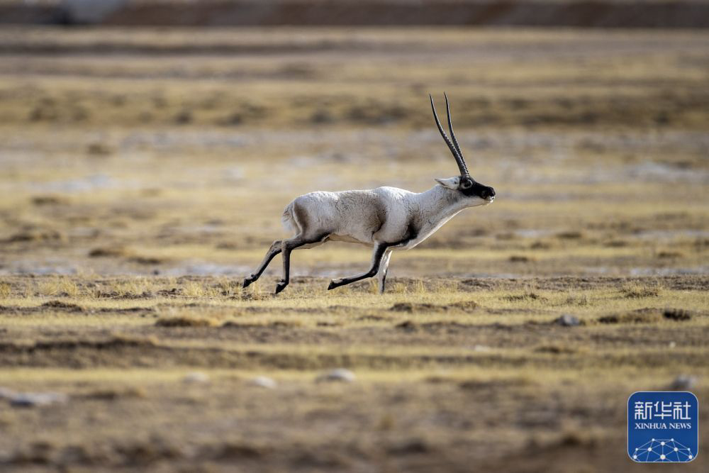 ↑ 在羌塘国家级自然保护区,一只雄性藏羚羊在奔跑(12月17日摄)。新华社记者 姜帆 摄