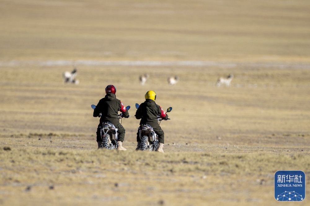 ↑ 在羌塘国家级自然保护区,野生动物管护队员骑着摩托车观察藏羚羊(12月17日摄)。新华社记者 姜帆 摄
