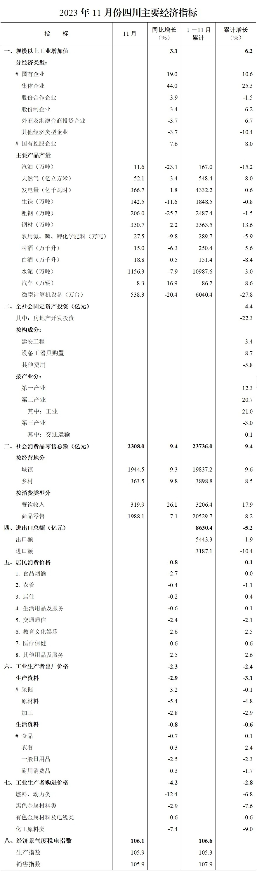 12月18日,省统计局发布前11月四川省国民经济主要指标数据。数据显示,1—11月,全省规模以上工业增加值同比增长6.2%,比全国高1.9个百分点;全省实现社会消费品零售总额23736亿元,同比增长9.4%,比全国高2.2个百分点,经济回升向好态势持续巩固。