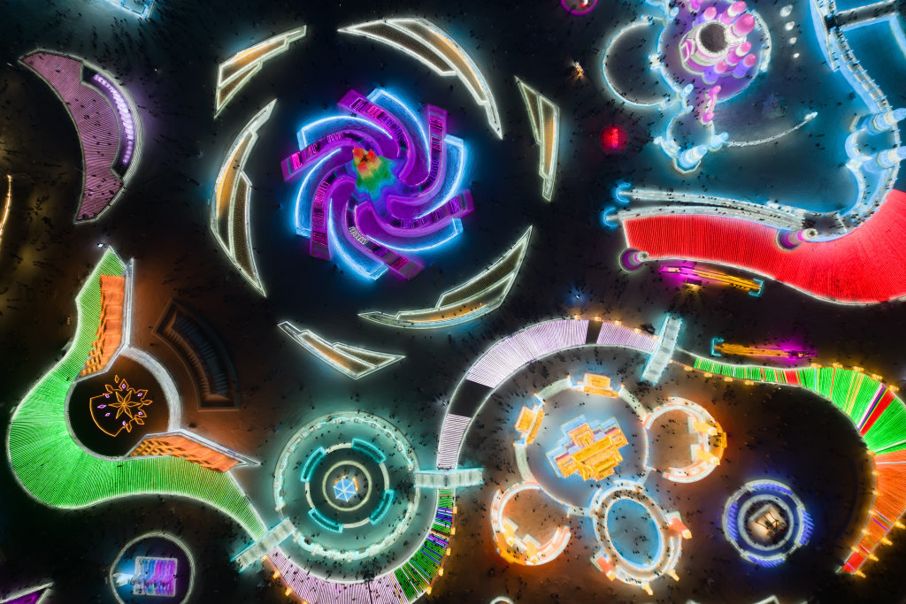 12月18日,游客在哈尔滨冰雪大世界园区游玩(无人机照片)。