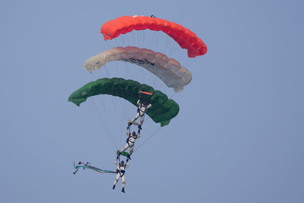 12月17日,在印度海得拉巴郊外,印度空军跳伞队在空军学校毕业典礼上表演。