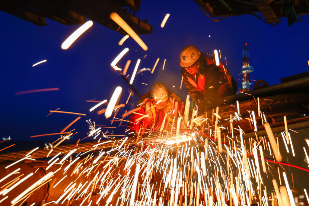 12月18日,在绥中36-1中心处理平台(CEPQ)作业现场,工人进行切割作业。