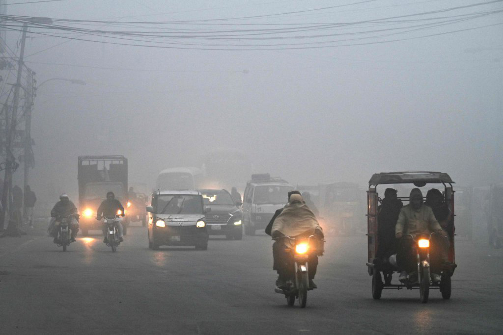12月18日,在巴基斯坦拉合尔,人们在雾霾中出行。
