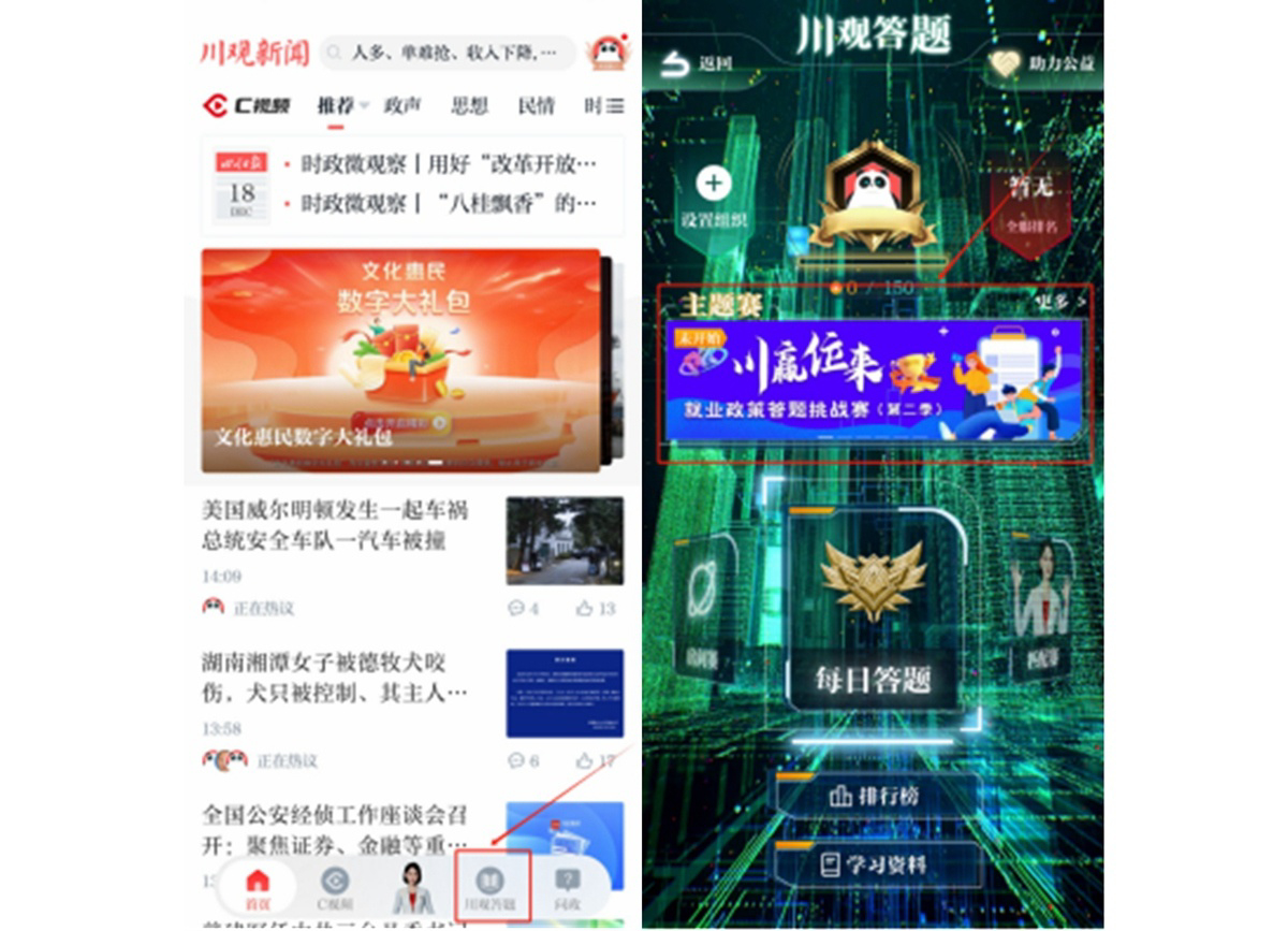 第二步在川观新闻首页,点击“川观答题”,找到“川赢位来就业政策答题挑战赛”活动图片,点击参与。