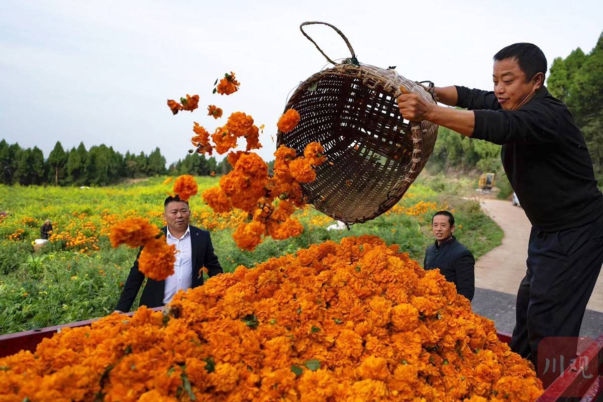 近日,德阳市旌阳区双东镇金锣桥村的村民正在产业园区采收万寿菊。 过去,金锣桥村的大多数村民都外出务工,造成大量土地撂荒长草。近年来,该村采取“支部+合作社+农户+企业”的订单农业产销模式,在曾经长满杂草的撂荒地上,建成了2000多亩的青花椒和色素万寿菊产业园,让乡村振兴的致富花朵开满山村。