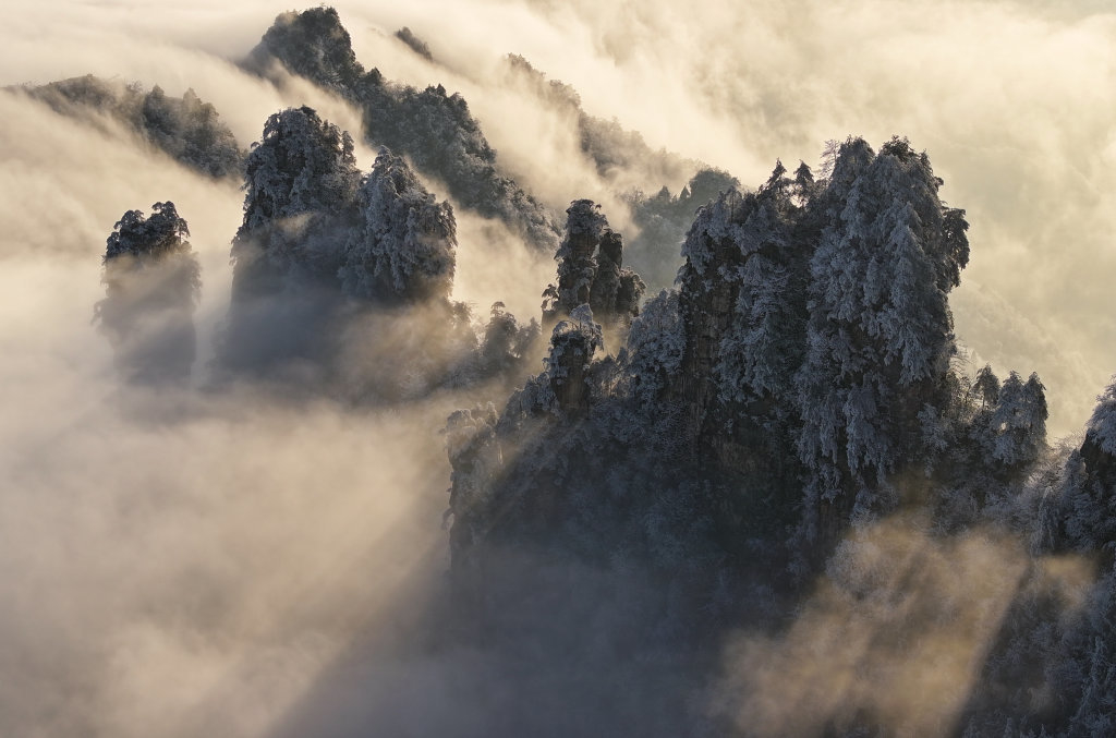 12月19日在湖南张家界国家森林公园天子山拍摄的雪后云雾景色(无人机照片)。