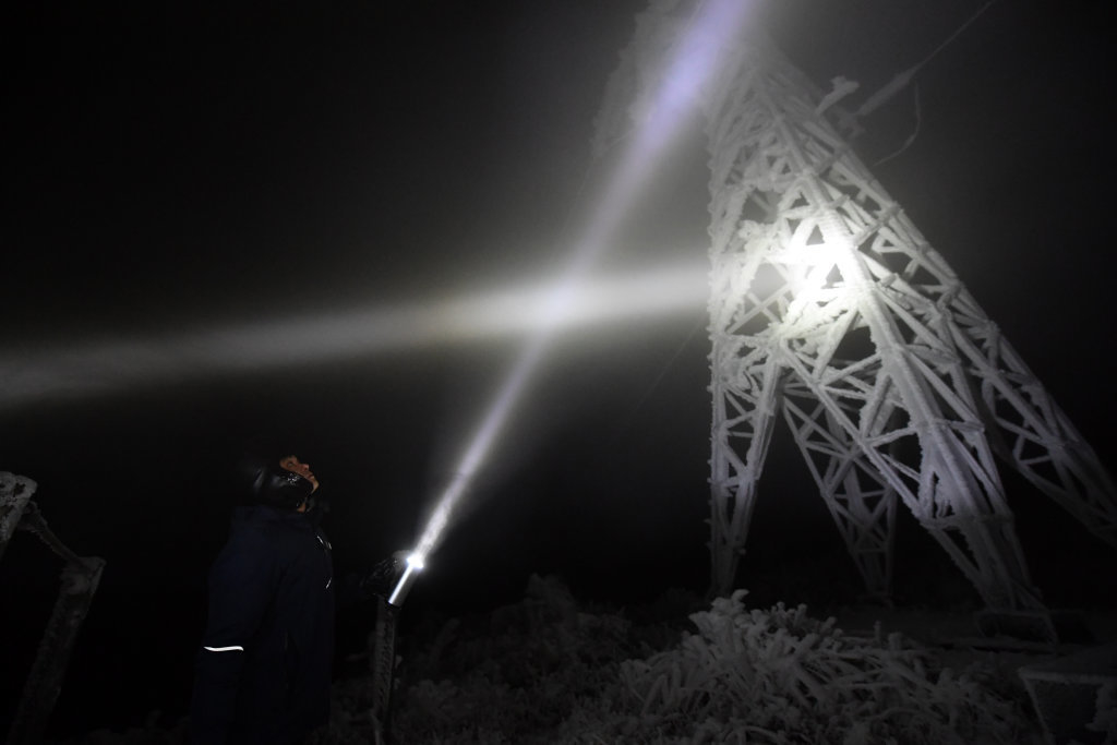 12月18日夜间,尹斌和龙昱君在110千伏西公线001号监测哨所观测铁塔覆冰情况。