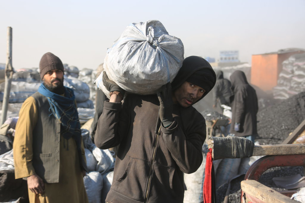 12月19日,人们在阿富汗喀布尔的一处煤炭市场工作。