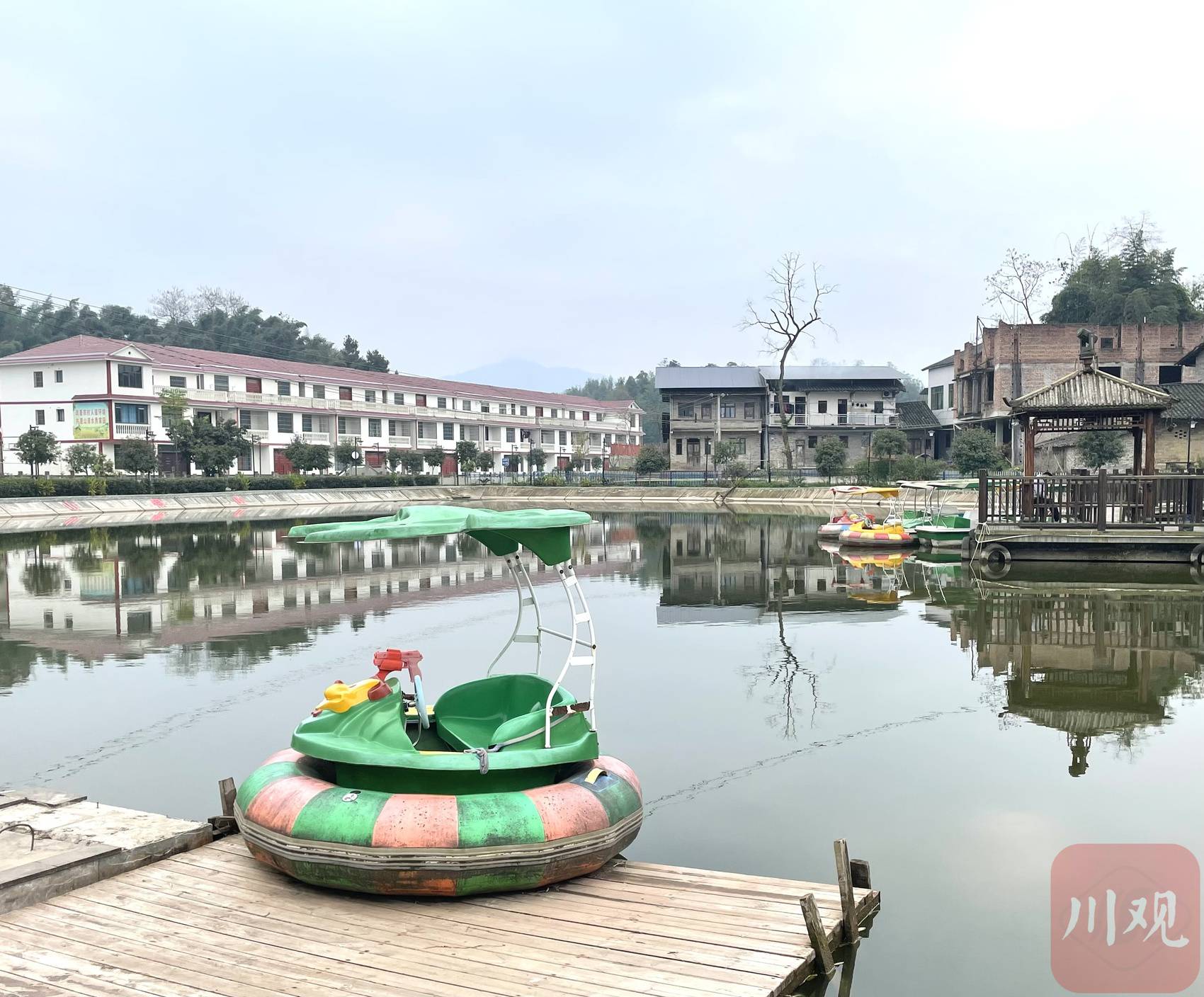 在观音镇场镇东部的朝印社区4组,一个人工湖镶嵌在居民聚居区入口处,湖边停靠着小游船,岸上的木制休闲亭倒影在湖里。“暑假、春节,游船生意火爆,收入上万元。”朝印社区党支部书记潘坤说,下一步,湖中要发展水面养殖,给村集体增加更多收益。