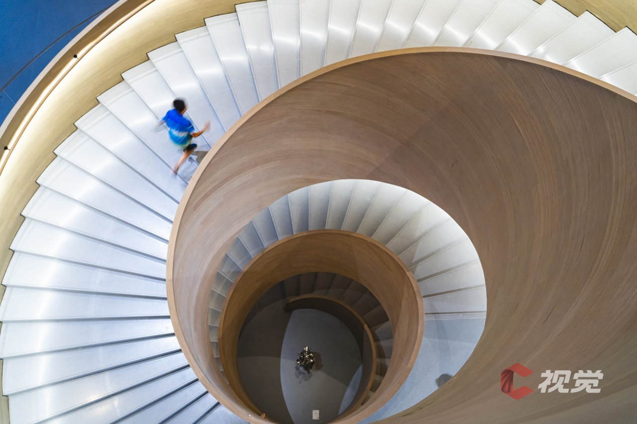 成都美术馆的旋转楼梯,通过图形加以蓝色运动人物进行点缀,让城市建筑更生动。