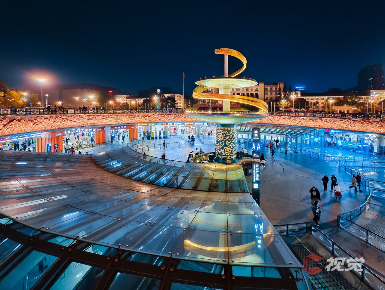 夜色中的天府广场,幽静的蓝色为底,衬托起暖色的灯光。