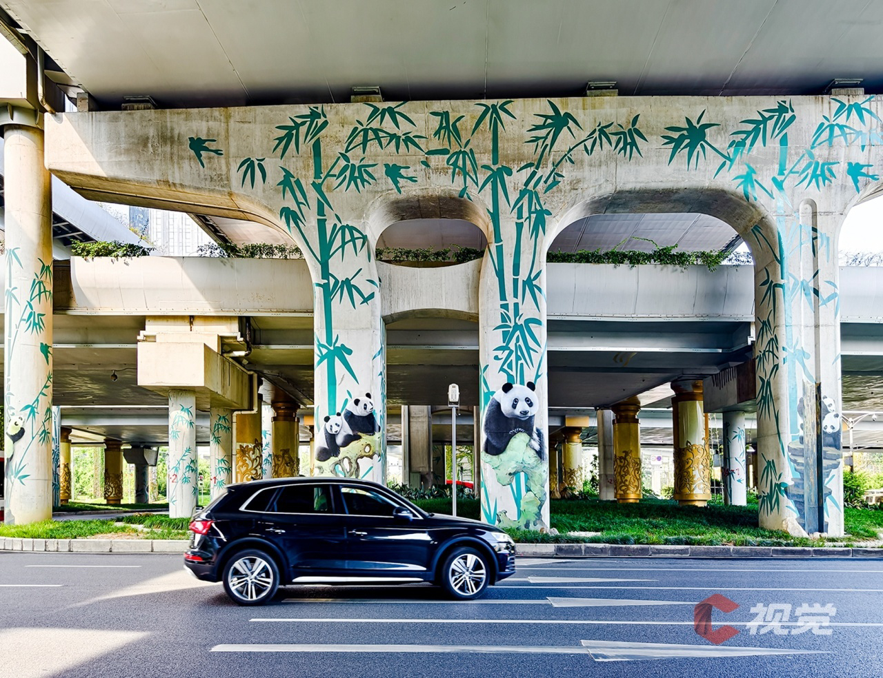 三环路金牛立交桥墩上的熊猫墙绘。