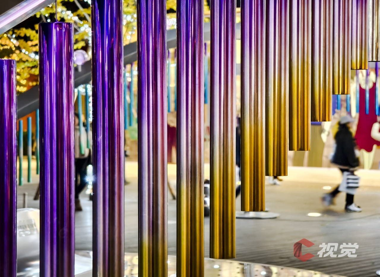 太古里广场大型音乐动态艺术装置,千枚“管钟”随风摆动,悦动的音符翩跹而至。