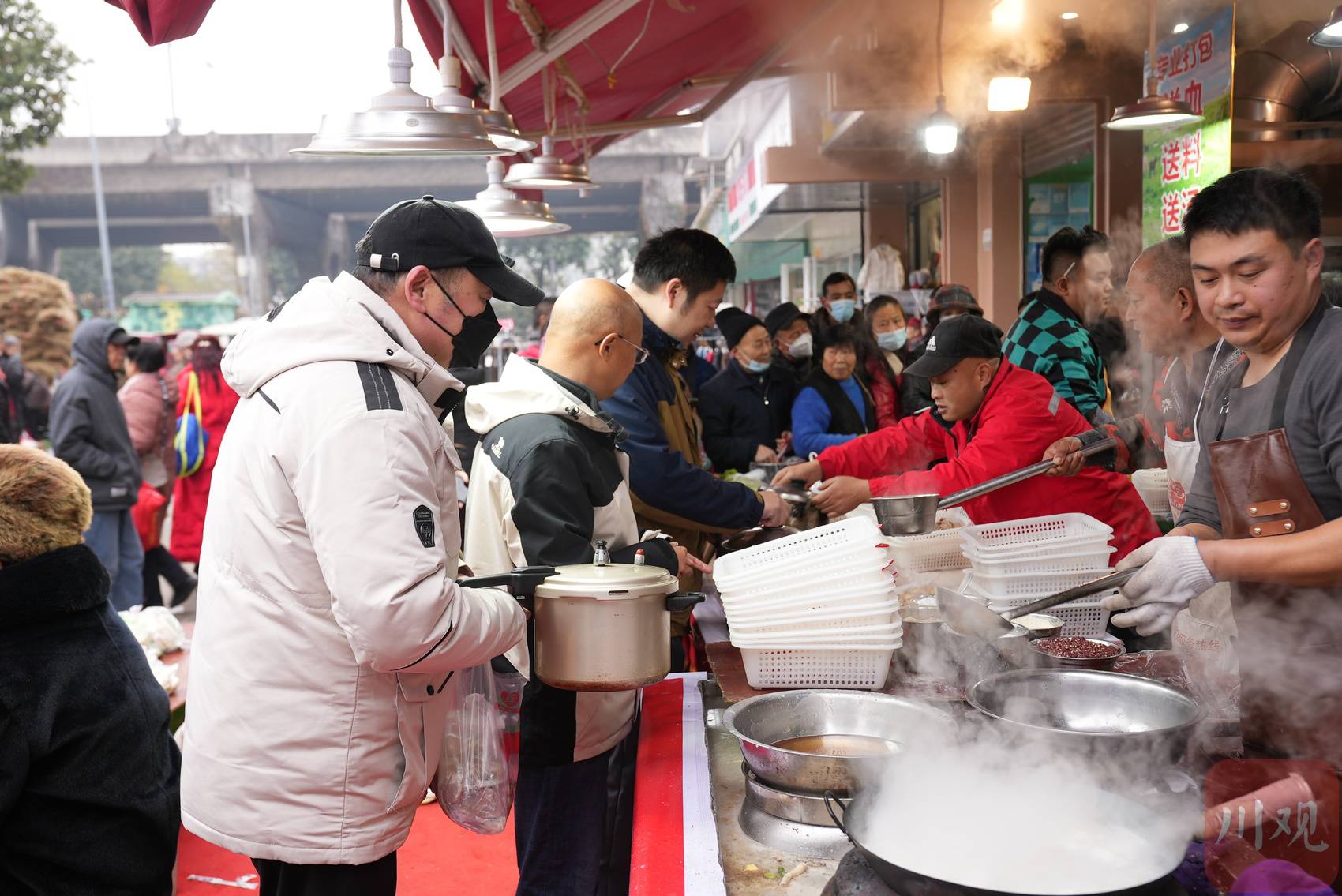 当天上午10点,位于成都市青羊区清溪西路的清溪菜市门前人头攒动,前来购买肉禽蔬果的人们络绎不绝,菜市入口处,便有羊肉汤现炒现卖。顾客挑选羊肉、羊杂,称重,配上姜葱,再有师傅现场爆炒约20秒,加入羊汤羊血,不一会儿,香气扑鼻的羊肉热汤就出锅了。记者在现场看到,除了有用塑料袋打包的,还有提着自家汤锅、高压锅、蒸锅来的,可谓是有备而来。
