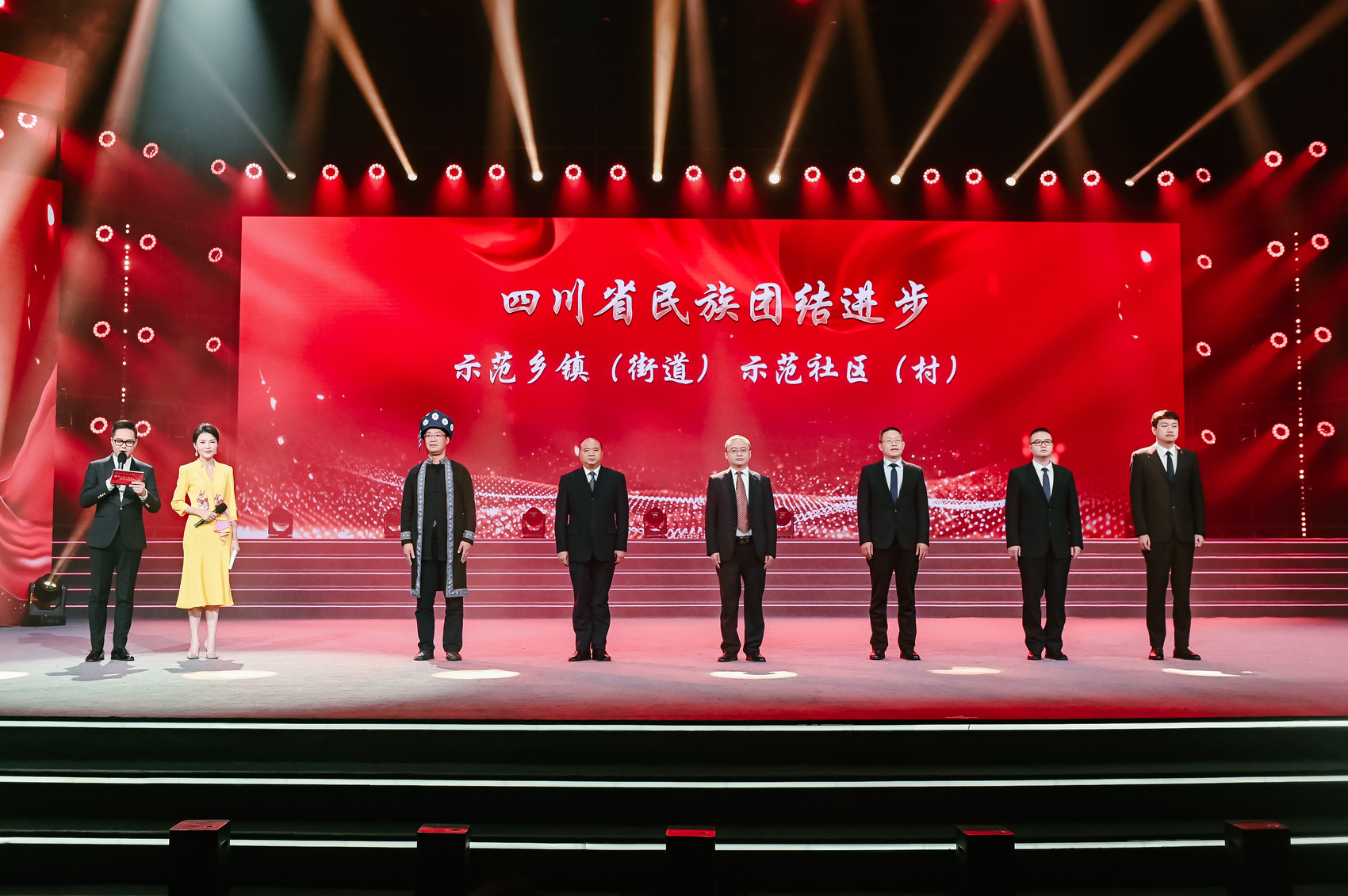 活动现场,主办方分三次向四川省民族团结进步示范乡镇、街道,示范社区、示范村代表,四川省民族团结进步示范园区、示范机关、示范企业、示范学校、示范医院代表以及全国民族团结进步示范州、示范县(区)授牌。他们是我省众多民族团结进步先进代表中的一份子。四川省深入开展民族团结进步创建,着力深化内涵、丰富形式、创新方法,创建全国民族团结进步示范区示范单位74个、全省民族团结进步示范区示范单位882个,各市(州)也命名了一批铸牢中华民族共同体意识工作成效突出的先进典型。