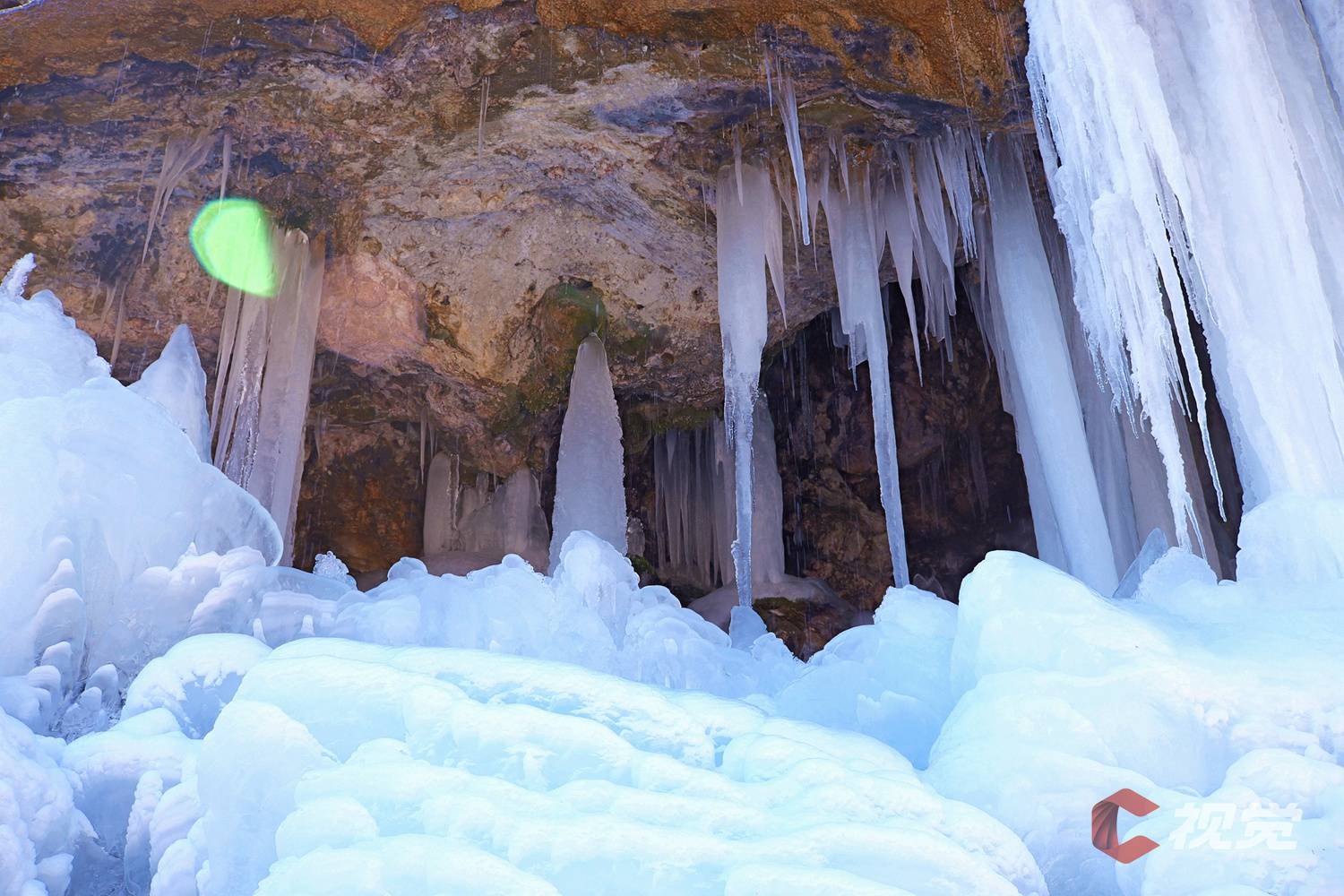 走近一些才发现,冰瀑布后面已形成一个冰洞,洞内被冰层覆盖,形成了不少冰柱、冰锥。这些大自然“雕刻”的艺术品,如同形态各异的水晶装饰一般耀眼。