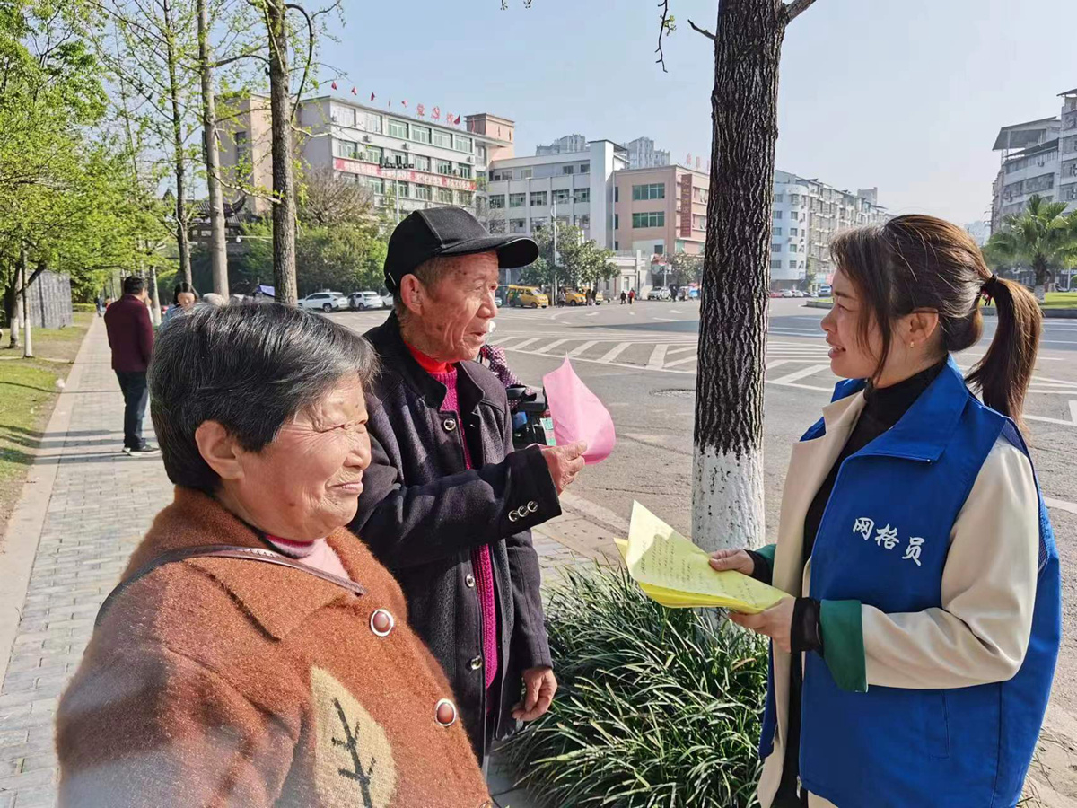 蓬溪县普安街道普安社区的网格员走上街头收集民情民意。蓬溪县委政法委供图