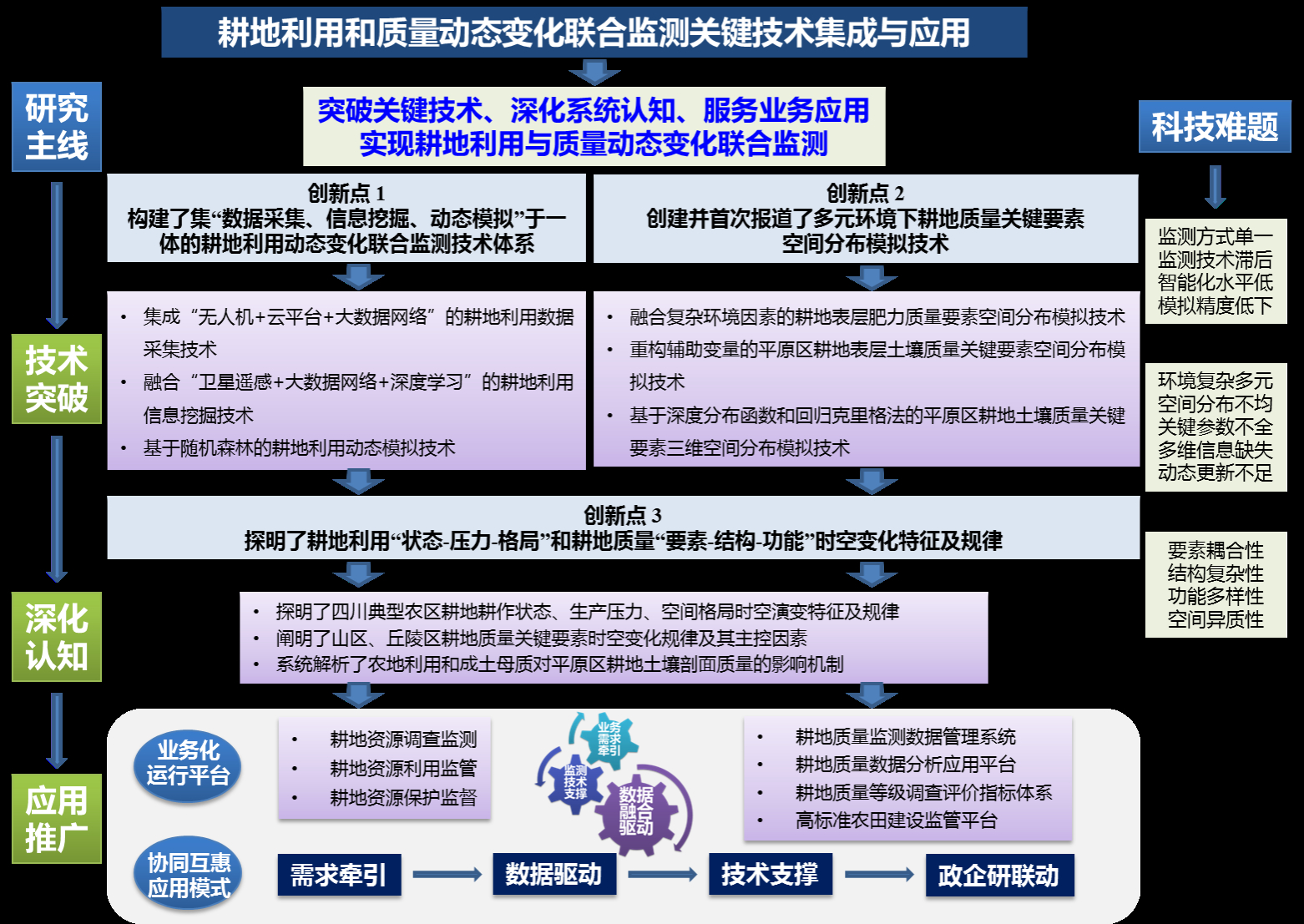 如何更高效地监测耕地变化?项目创建了“空(无人机航空遥感)—地(“天府调查云”平台)—网(大数据网络)”耕地利用采集技术,并构建融合“卫星遥感—大数据网络—深度学习”的耕地利用信息挖掘技术。