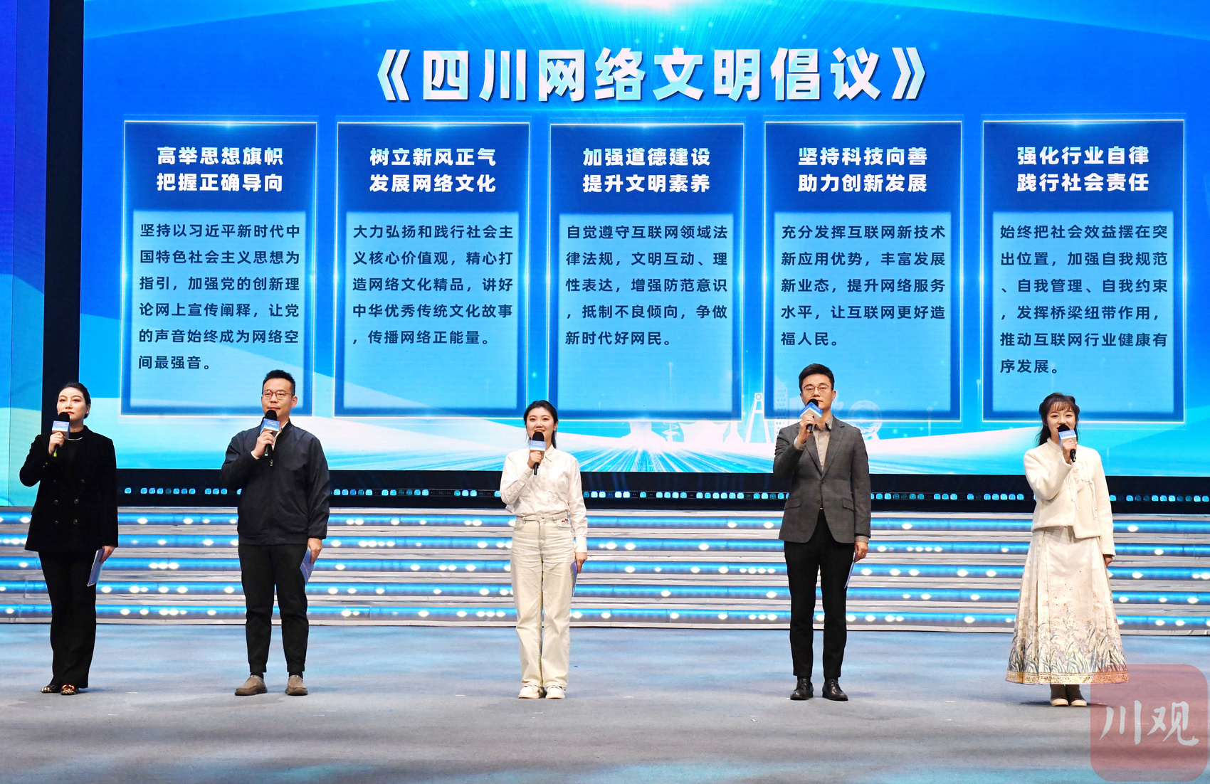 活动中,来自互联网不同领域的5名代表共同宣读了《四川网络文明倡议》。全文如下: