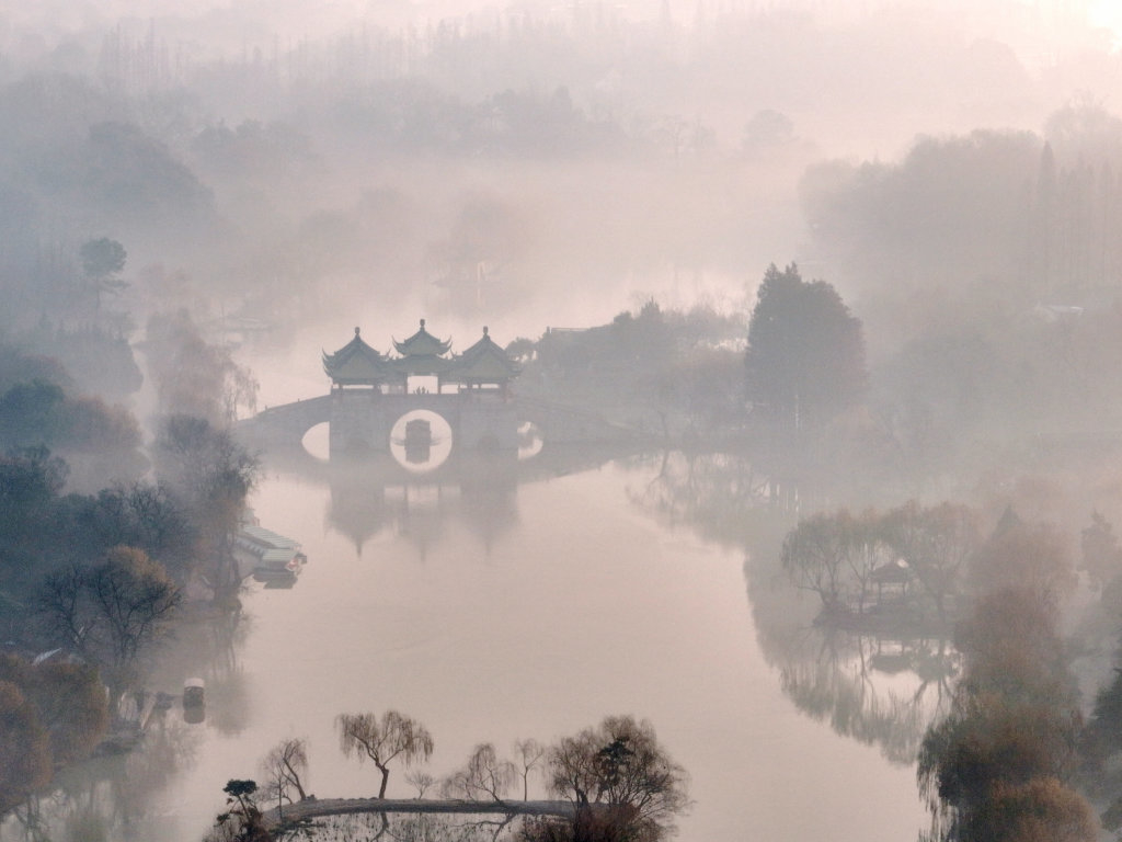 当日,江苏省扬州市出现大雾天气,扬州瘦西湖风景区的湖面轻雾缭绕,景观在雾中若隐若现,宛如一幅水墨画。