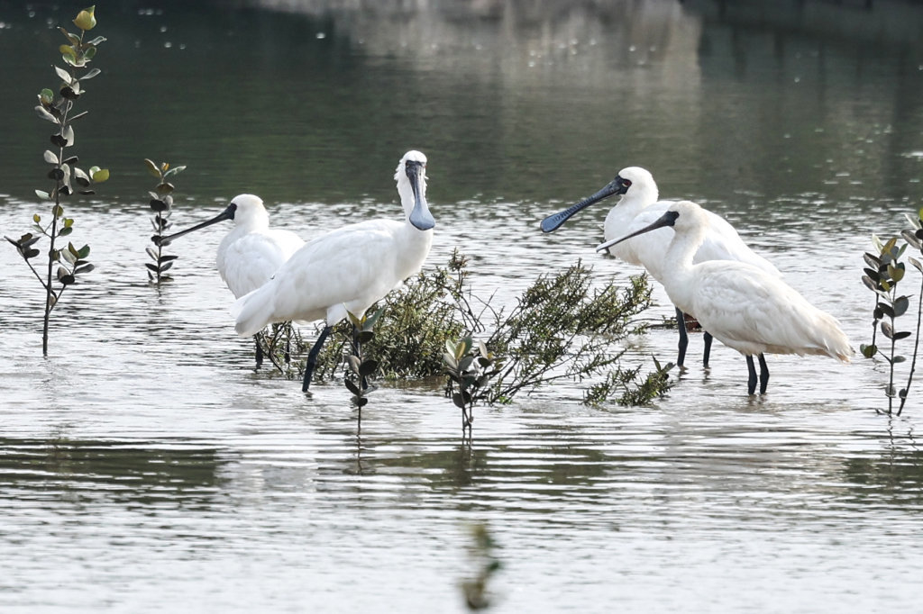 一群黑脸琵鹭在海南新盈红树林国家湿地公园觅食(12月27日摄)。新华社记者 张丽芸 摄