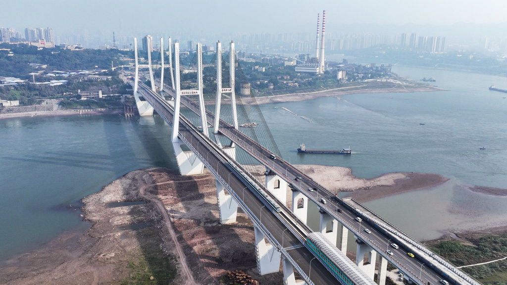 12月28日,列车行驶在重庆轨道交通18号线李家沱长江复线桥(无人机照片)。新华社发(罗斌 摄)