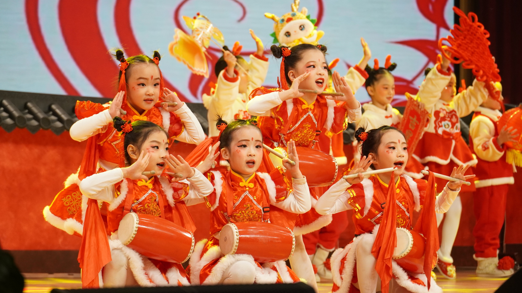 2024年锦江校园新年音乐会上,成都市第一幼儿园、成都市锦江区三官堂街幼儿园带来的《龙吟鼓韵庆丰年》