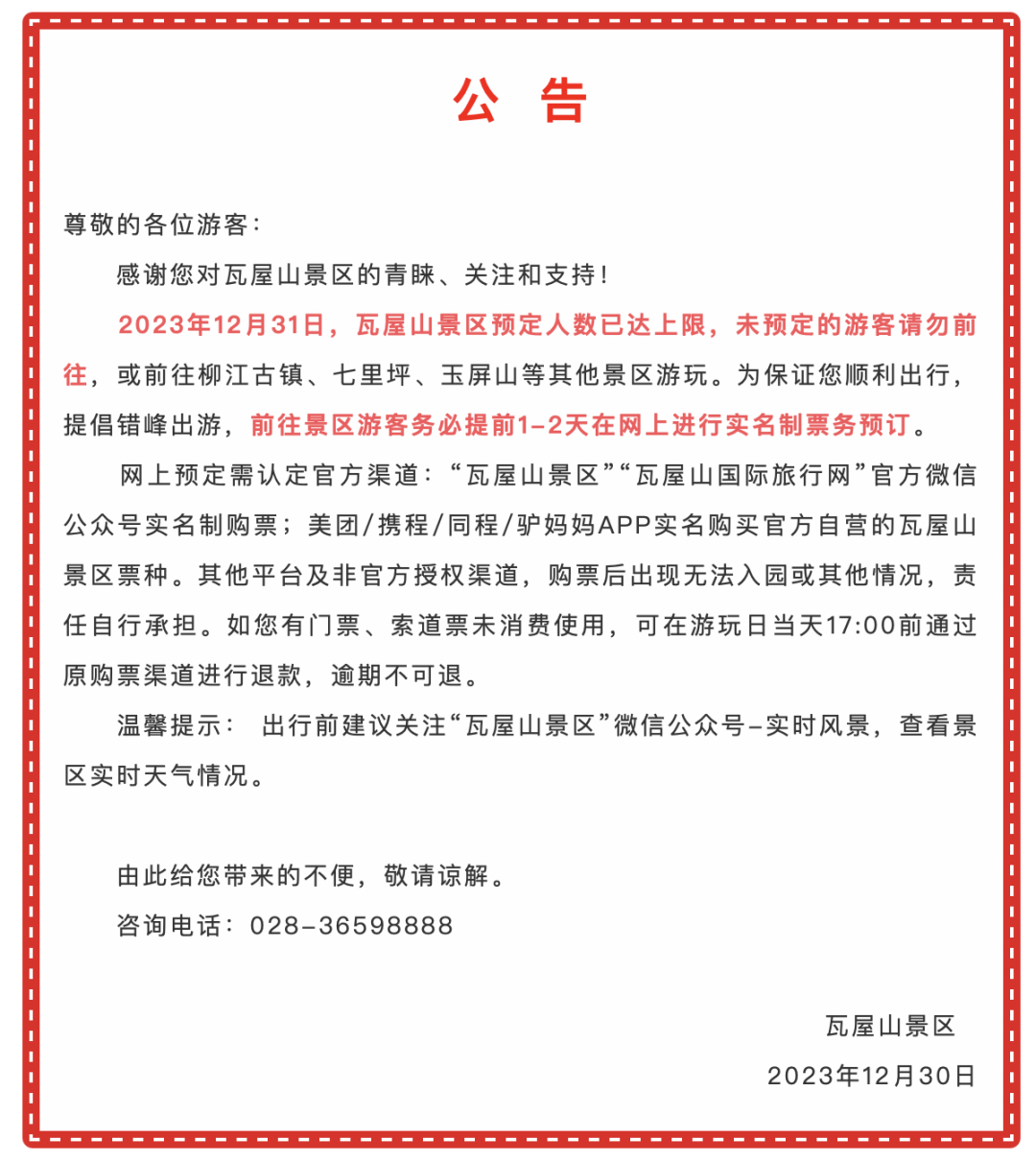12月30日,瓦屋山景区发布公告,2023年12月31日,瓦屋山景区预定人数已达上限,未预定的游客请勿前往,或前往柳江古镇、七里坪、玉屏山等其他景区游玩。为保证您顺利出行,提倡错峰出游,前往景区游客务必提前1-2天在网上进行实名制票务预订。