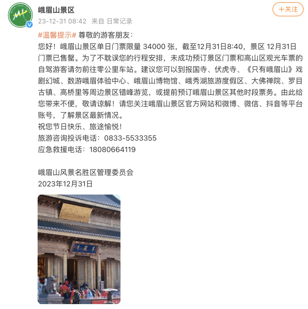 据峨眉山景区,峨眉山景区单日门票限量34000张,截至12月31日8:40,景区12月31日门票已售罄。为了不耽误您的行程安排,未成功预订景区门票和高山区观光车票的自驾游客请勿前往零公里车站。