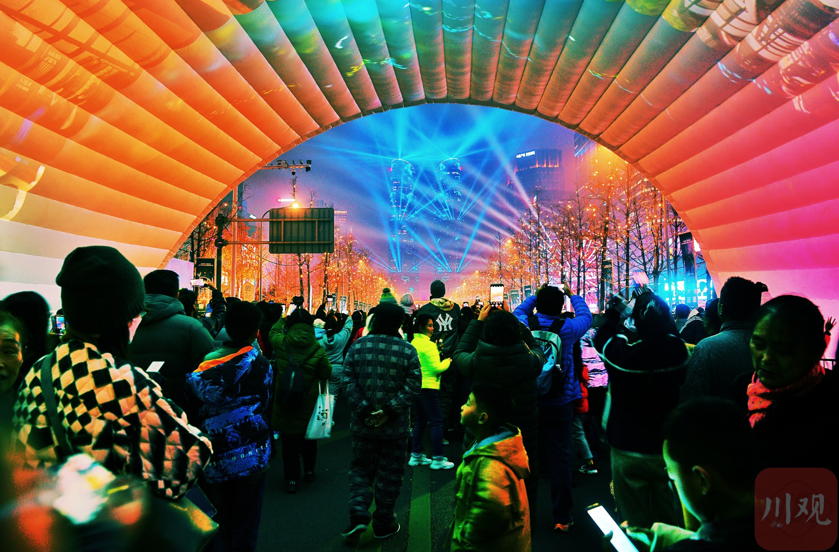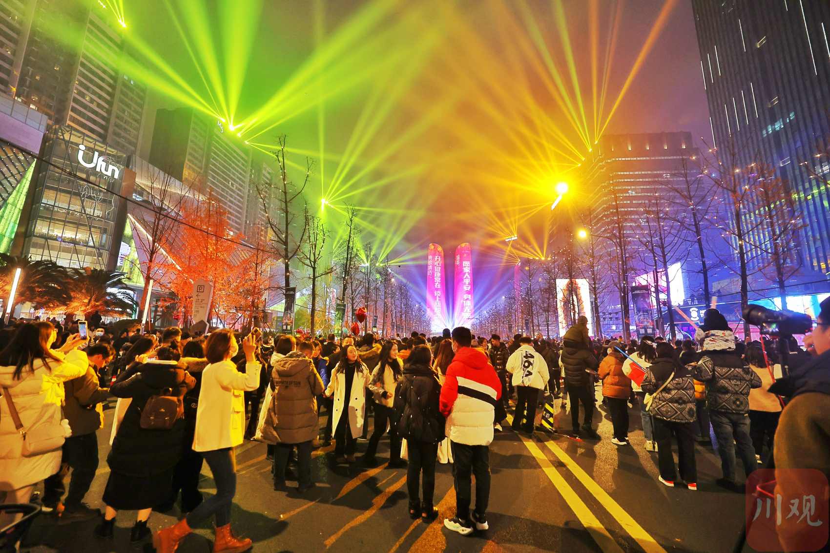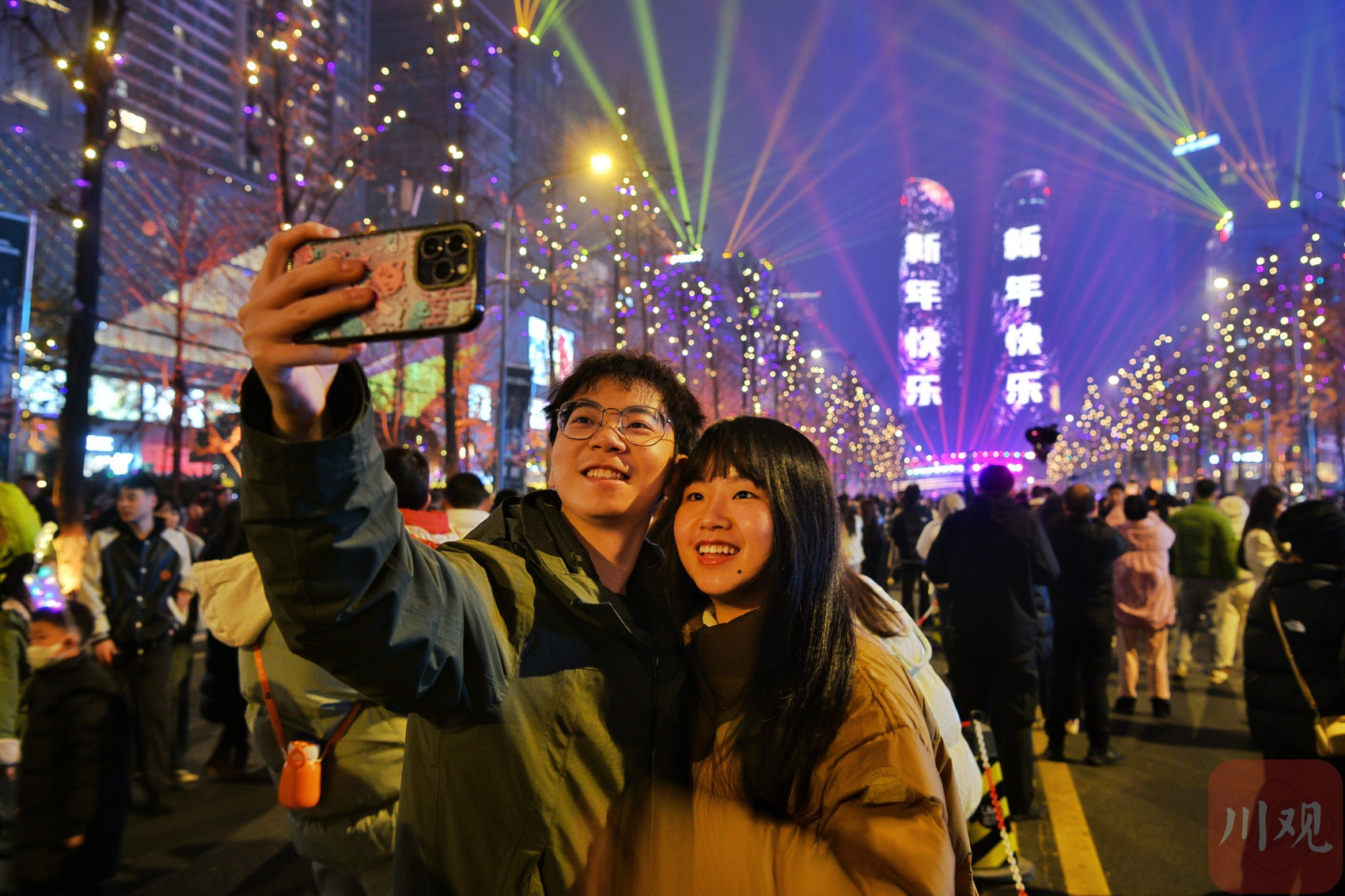 市民在交子大道璀璨灯光秀中迎接新年